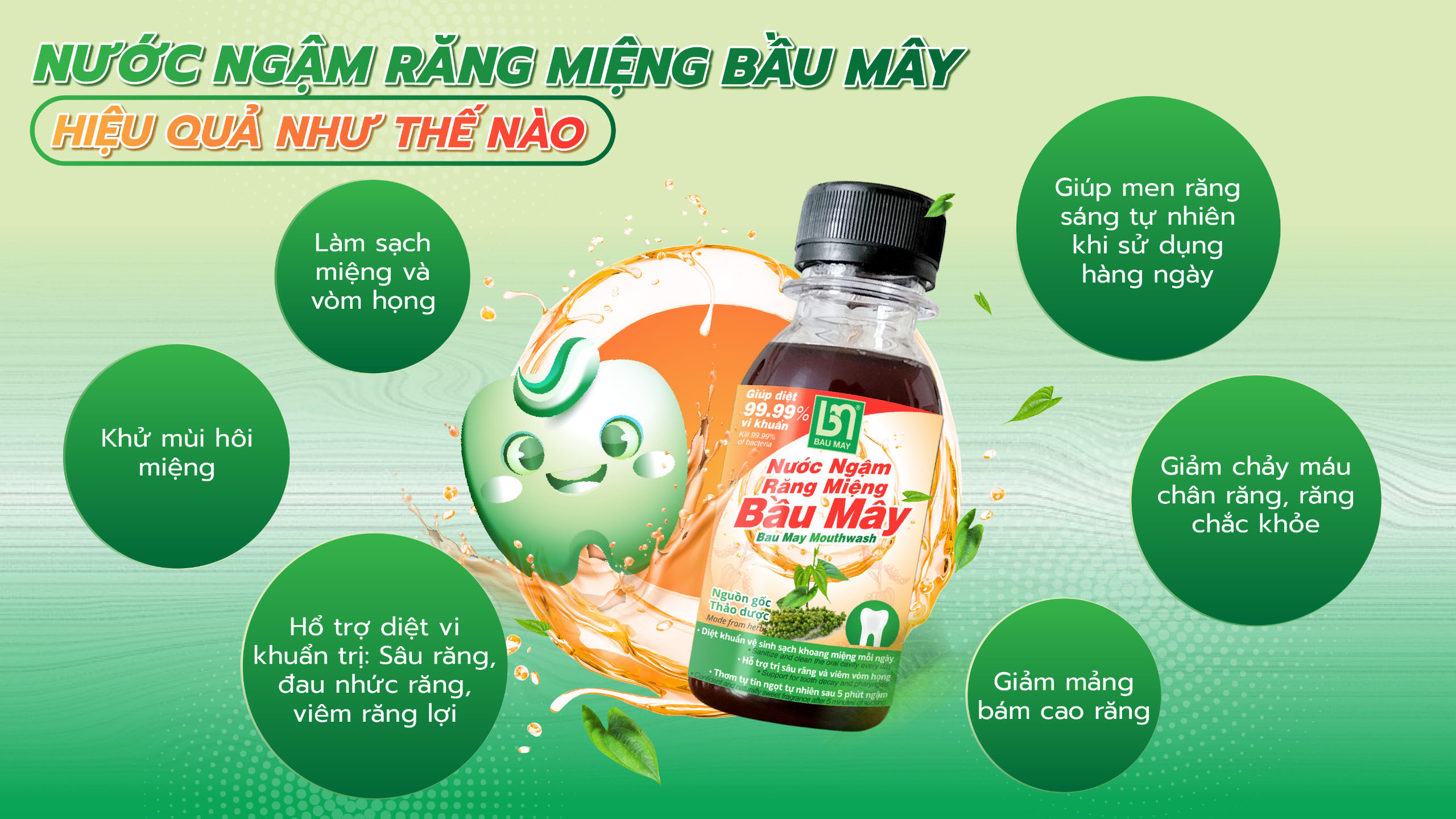 Nước ngậm răng miệng Bầu Mây là sản phẩm được chế biến từ các thành phần tự nhiên như Tiêu Bầu Mây, nhụy tiêu, Hoài sơn Bầu Mây, rượu Hoài sơn Bầu Mây và cam thảo nam. Sản phẩm này không gây tác dụng phụ và có thể sử dụng trong vòng 5 năm kể từ ngày sản xuất.