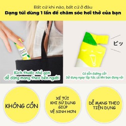 Mua tại TiktokNƯỚC SÚC MIỆNG OKUCHI GACHI LEMON X5 CHANH OKUCHI GACHI LEMON Quy cách: 5 Thanh/Gói Mã vạch: 4562384608976 XuấtXứ: Nhật Bản – Công Nghệ Hàn Quốc Nước súc miệng được chiết xuất từ Bạc Hà, Mật Ong, Lá Trà Xanh,... giúp làm sạch mảng bám cứng đầu do trà, cà phê, thức ăn có màu,... ngăn ngừa tình trạng viêm nướu. GẤP 5 HÀM LƯỢNG TINH DẦU CHANH GIÚP HƠI THỞ THƠM HƠN. Công Dụng Nước Súc Miệng Tinh Dầu Chanh Okuchi Gachi Lemon X5: Nước súc miệng giúp làm sạch răng miệng, giảm mảng bám trên răng, làm giảm mùi hôi miệng, cho hơi thở thơm mát. Hướng Dẫn Sử Dụng: Cho trực tiếp sản phẩm vào khoan miệng, súc trong 20 giây, không cần súc lại bằng nước. Dùng sau khi đánh răng hoặc ngày 3 lần. Bảo Quản: Tránh để nơi quá lạnh và ánh nắng trực tiếp vào sản phẩm, để xa tầm tay trẻ em khi không sử dụng. Lưu ý: Không được nuốt. Nếu có triệu chứng gì bất thường thì ngừng không được sử dụng. Thành Phần Nước Súc Miệng Tinh Dầu Chanh Okuchi Gachi Lemon X5 Thành Phần Chính: Nước súc miệng được chiết xuất từ Bạc Hà, Mật Ong, Lá Trà Xanh,.. giúp làm sạch mảng bám cứng đầu do trà, cà phê, thức ăn có màu...,ngăn ngừa tình trạng viêm nướu. GẤP 5 HÀM LƯỢNG TINH DẦU CHANH GIÚP HƠI THỞ THƠM HƠN. Thành Phần Chi Tiết: Purified water (Water), Glycerin, PEG-40, Malic Acid, Citric acid, Allantoin, Fragrance (Citrus flavoring, Lemon flavoring, Lemon Oil flavoring), Sodium Benzoate, Xylitol, Sodium Citrate, Caramel, Camellia Sinensis Leaf Extract, Menthol (L-Menthol), Propolis Extract, Chitosan.