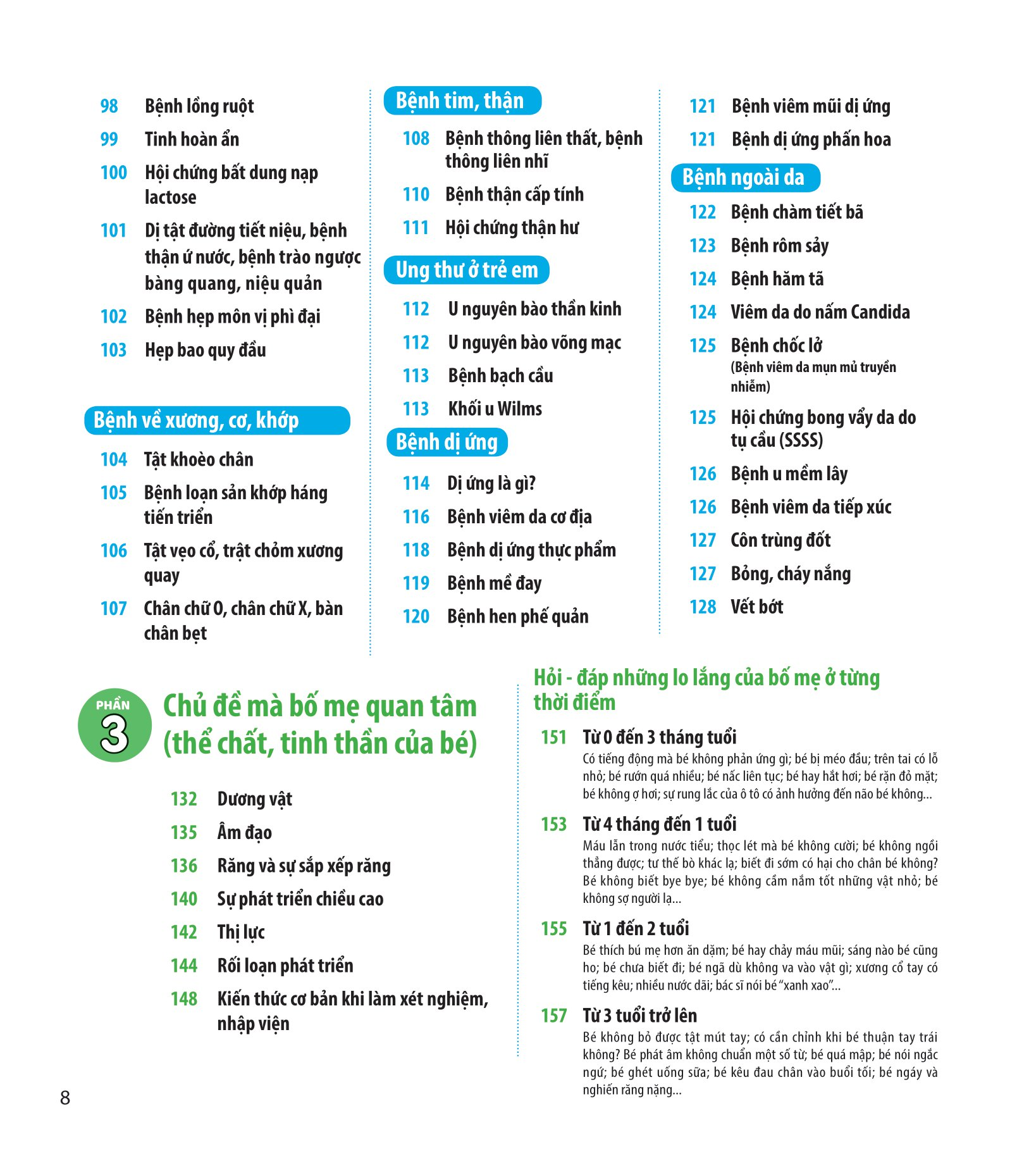 Các loại bệnh thường gặp: Sách chia sẻ về các bệnh về hô hấp, tiêu hóa, da liễu, thần kinh... thường gặp ở trẻ nhỏ, giúp bố mẹ nhận biết sớm các dấu hiệu bất thường.
