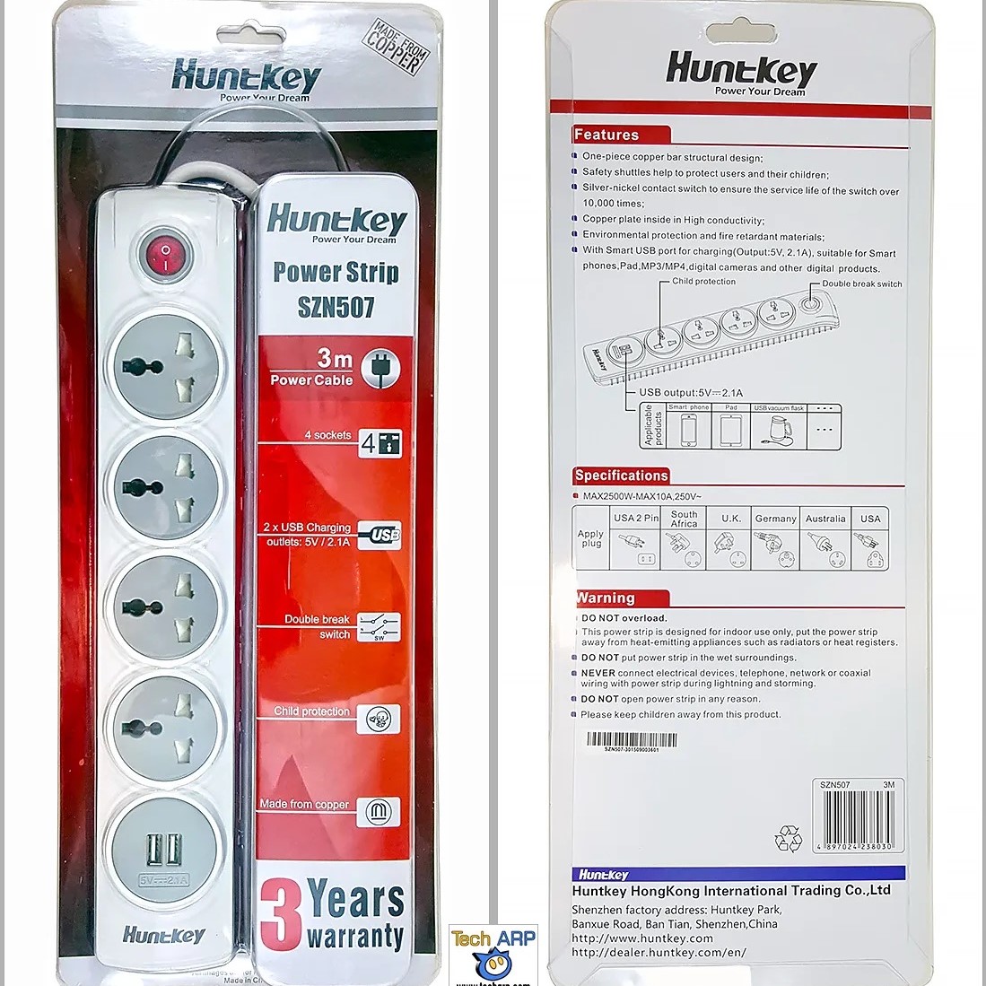 Ổ CẮM ĐIỆN THÔNG MINH ĐA NĂNG HUNTKEY SZN-507-2.1A (3M) * Thiết kế sang trọng, sản phẩm dành cho thị trường EU, Nhật Bản. * Độ dài dây cáp: 3mét * 4 ổ cắm