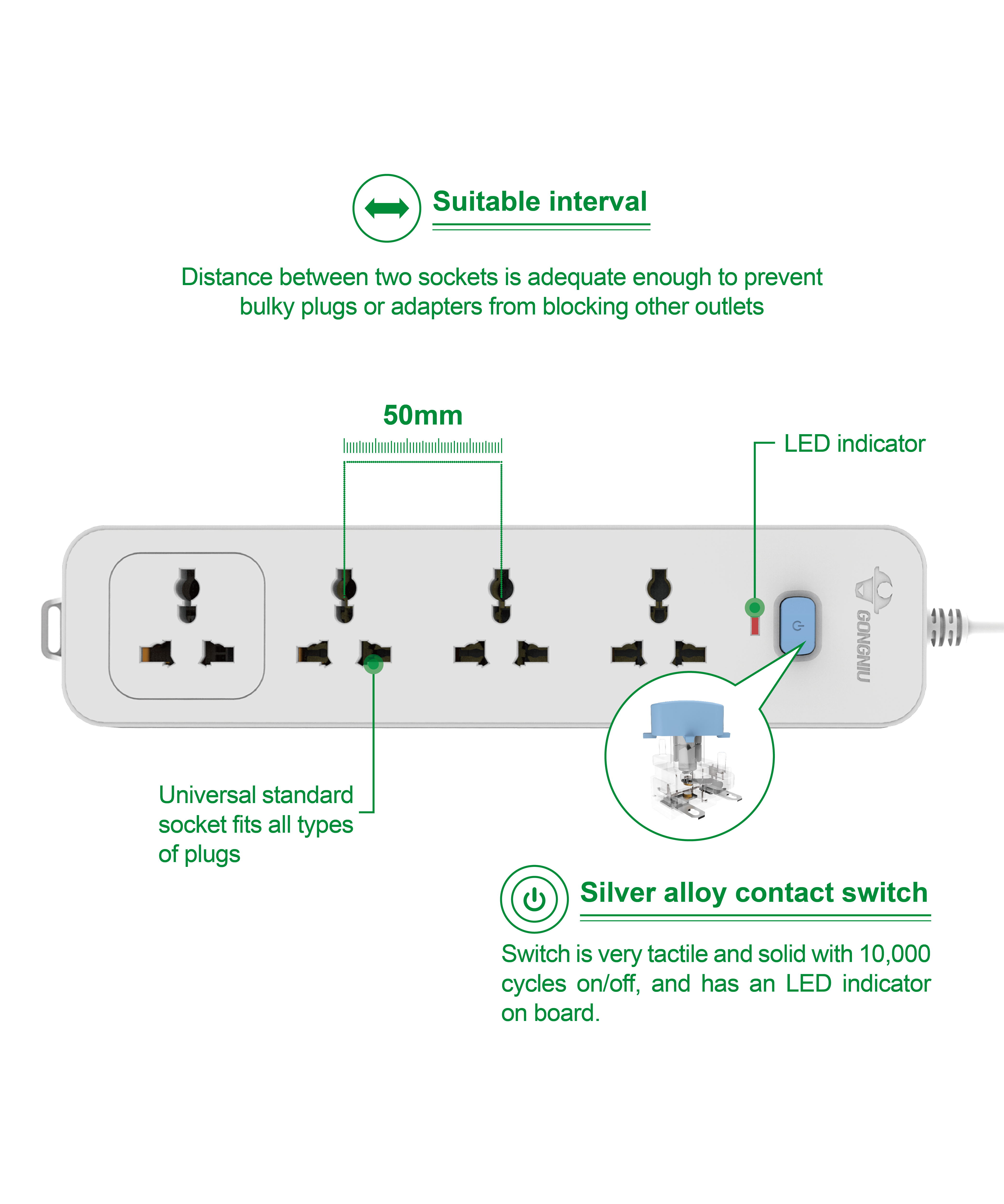 Tính năng nổi bật của ổ cắm điện Gongniu 4 ổ đa năng 1 công tắc - công suất 10A/250/2500W - Chính hãng (N1040):