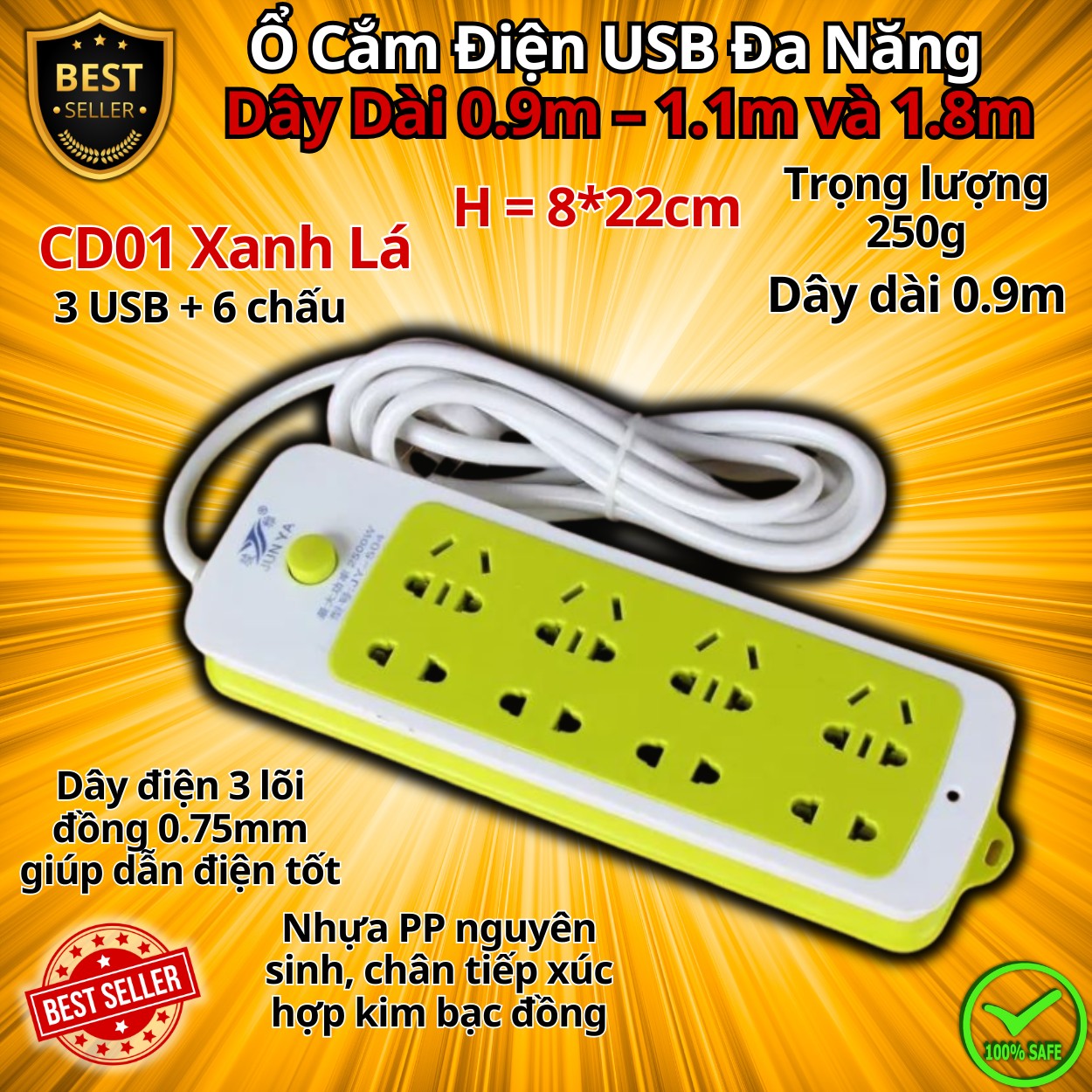 Ổ Cắm Điện USB Đa Năng Cao Cấp Chống Giật Dây Dài 0.9m – 1.1m và 1.8m Ổ Cắm Điện Công Suất 2500W Có Chốt An Toàn Tiện Lợi, Chính Hãng   ✅ Mã ổ cắm CD01 – dây 0.9m – màu xanh lá ✅ Mã ổ cắm CD02 Trắng 7 màu – dây 1.8m ✅ Mã ổ cắm CD03 Trắng 6 chấu – dây 1.1m