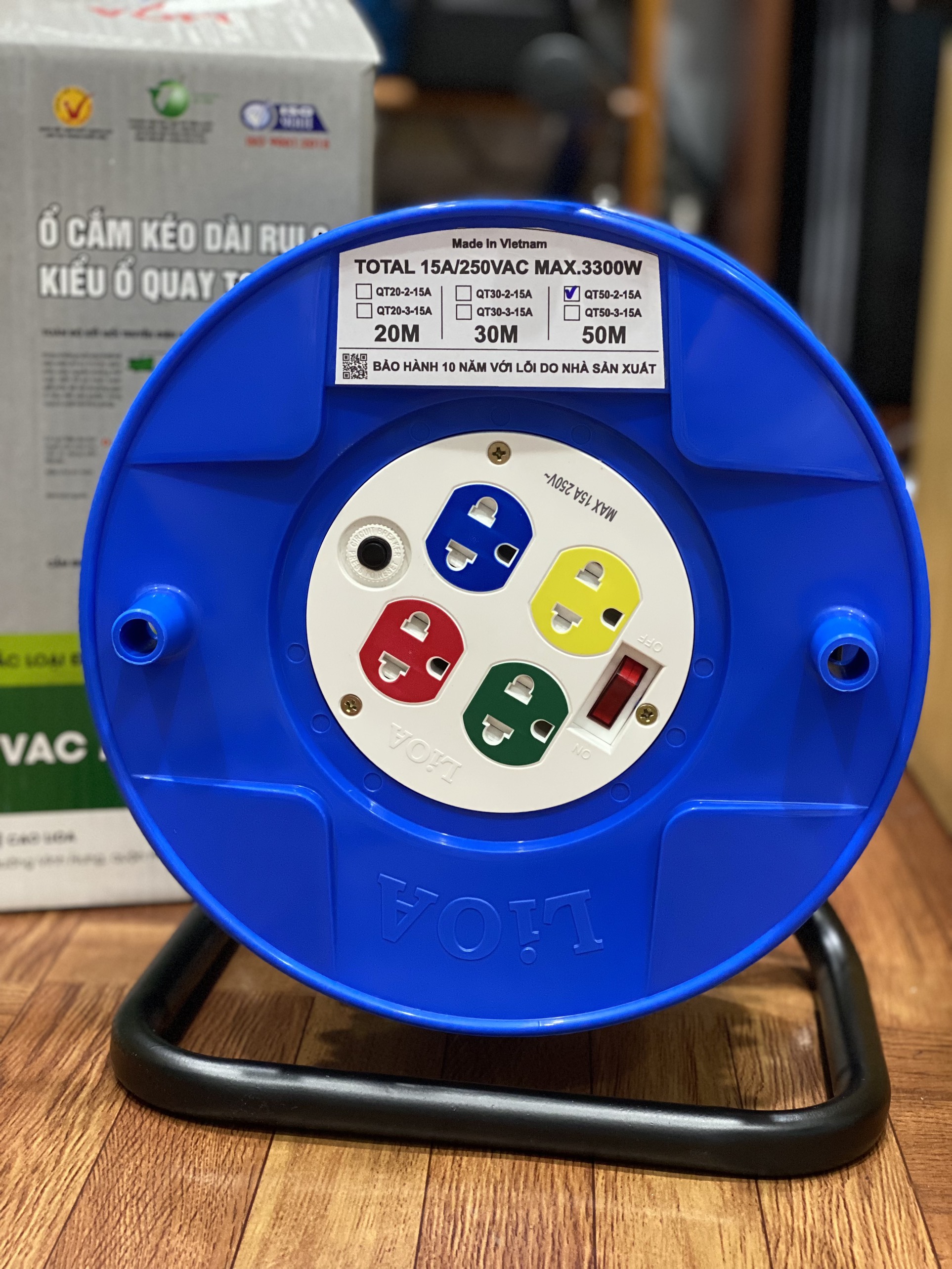 🔴 Ổ Cắm Kéo Dài Quay Tay Kiểu Rulo LiOA QT50-2-15A 50M 3300W Cuộn Dây Xách Tay