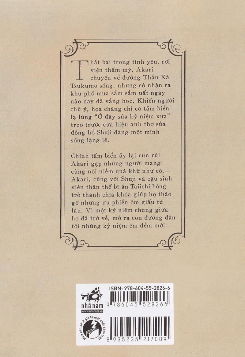 Mua tại TiktokThất bại trong tình yêu, rời viện thẩm mỹ, Akari chuyển về đường Thần Xã Tsukumo sống, nhưng cô nhận ra khu phố mua sắm sầm uất ngày nào nay đã vắng hoe. Khiến người chú ý, họa chăng chỉ có tấm biển lạ lùng “Ở đây sửa kỷ niệm xưa” treo trước cửa hiệu anh thợ sửa đồng hồ Shuji đang một mình sống lặng lẽ. Chính tấm biển ấy lại run rủi Akari gặp những người mangcùng nỗi niềm quá khứ như cô. Akari, cùng với Shuji và cậu sinh viên thân thế bí ẩn Taichi bỗng trở thành chìa khóa giúp họ tháo gỡ những ưu phiền ôm giấu từ lâu. Vì một kỷ niệm chunggiữa họ đã trởvề, mở ra con đường dẫn tới những kỷ niệm êm đềm mới…