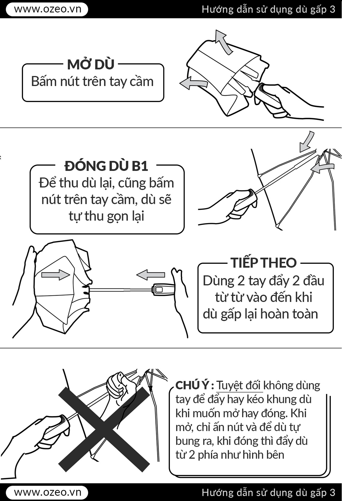 - Khi thu ô dù, ngoài việc bấm nút để thu lại sau đó quý khách dùng tay ấn từ chóp ô để thu phần que ngắn lại như trước khi mở vào lần tới.