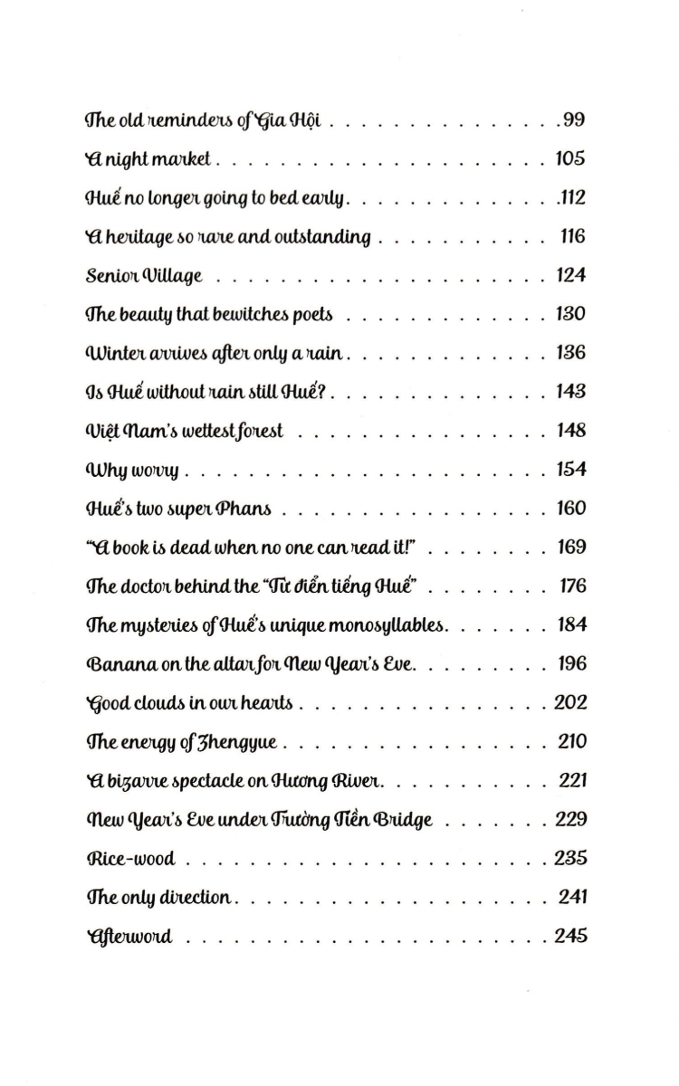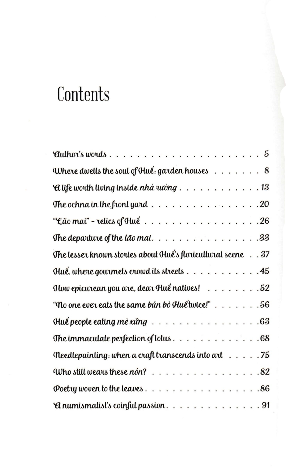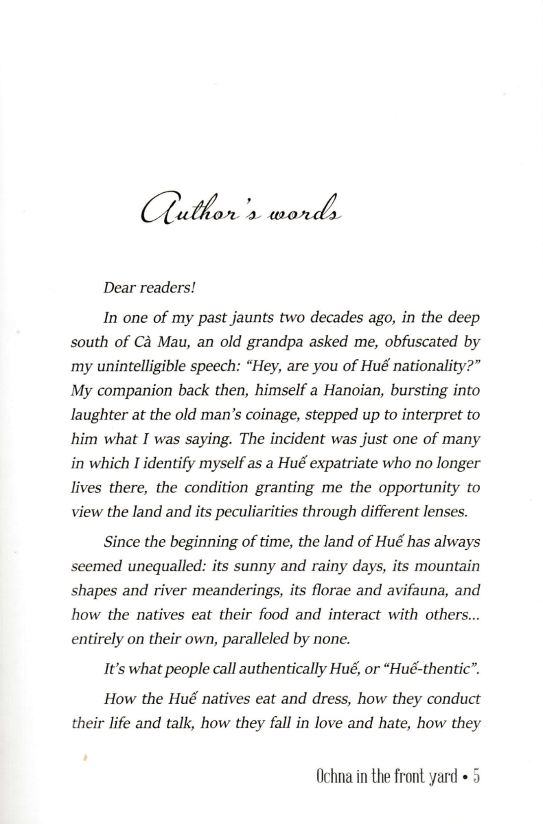 Mua tại TiktokOchna In The Front Yard - Fascinating Stories About Huế - An Ancient, Poetic And Glamorous Land GIỚI THIỆU SÁCH: Ochna In The Front Yard - Fascinating Stories About Huế - An Ancient, Poetic And Glamorous Land là tập ghi chép về “nước Huế” phong rêu kiêu sa của nhà báo Minh Tự. Hơn ba mươi bài viết của tác giả trong cuốn sách sách hầu hết được viết vào những năm 2000 - 2002, khi anh từ Đà Lạt trở về quê hương sau gần 10 năm tha phương; và trong lần tái bản này, tác giả có cập nhật, chỉnh sửa các bài viết cho hoàn thiện thêm, cùng hình ảnh minh họa sinh động. Tập ghi chép đã khắc họa đậm nét văn hóa, lối sống của người Huế dưới các góc nhìn khác nhau, từ chuyện ăn theo lối Huế, chuyện cơm hến, mè xửng, tô bún bò đến đường kim mũi chỉ, vành nón bài thơ, gốc mai lão trượng hay phiên chợ khuya, mà với tác giả, đó là “lối Huế”. Chia sẻ về đứa con tinh thần của mình, tác giả Minh Tự nói: “Những tháng năm tôi được làm một người Huế sống ngoài Huế, và nhờ vậy mới hiểu rõ hơn, một cách khách quan hơn, về bản sắc riêng biệt của xứ sở nà Cuốn sách này xin cùng khám phá nghệ thuật sống của người Huế, dù không thể nói hết muôn màu muôn vẻ của ‘lối Huế’. Nó chỉ là những trạng thái của Huế được chúng tôi ‘đọc’ được và thuật lại bằng cách của một người viết báo.”
