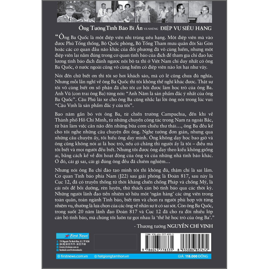 Với mong muốn tôn vinh người anh hùng thầm lặng và để nhiều người hiểu thêm về những chiến công hiển hách cũng như những hy sinh thầm lặng của lực lượng tình báo Việt Nam, Thượng tướng Nguyễn Chí Vịnh đã đề nghị hai nhà báo Hoàng Hải Vân và Tấn Tú tập hợp và biên soạn các bài báo, kèm theo một số thông tin mới cùng những suy ngẫm của họ qua 20 năm nhìn lại. Cuốn sách “Ông tướng tình báo bí ẩn và những điệp vụ siêu hạng” tập hợp loạt ký sự dài 36 kỳ được đăng trên báo Thanh Niên vào năm 2004, đồng thời bổ sung một phần về hoạt động của ông Ba Quốc sau năm 1975 – với những chiến công mà các tác giả phải thừa nhận là “lừng lẫy” hơn những gì họ có thể tưởng tượng.