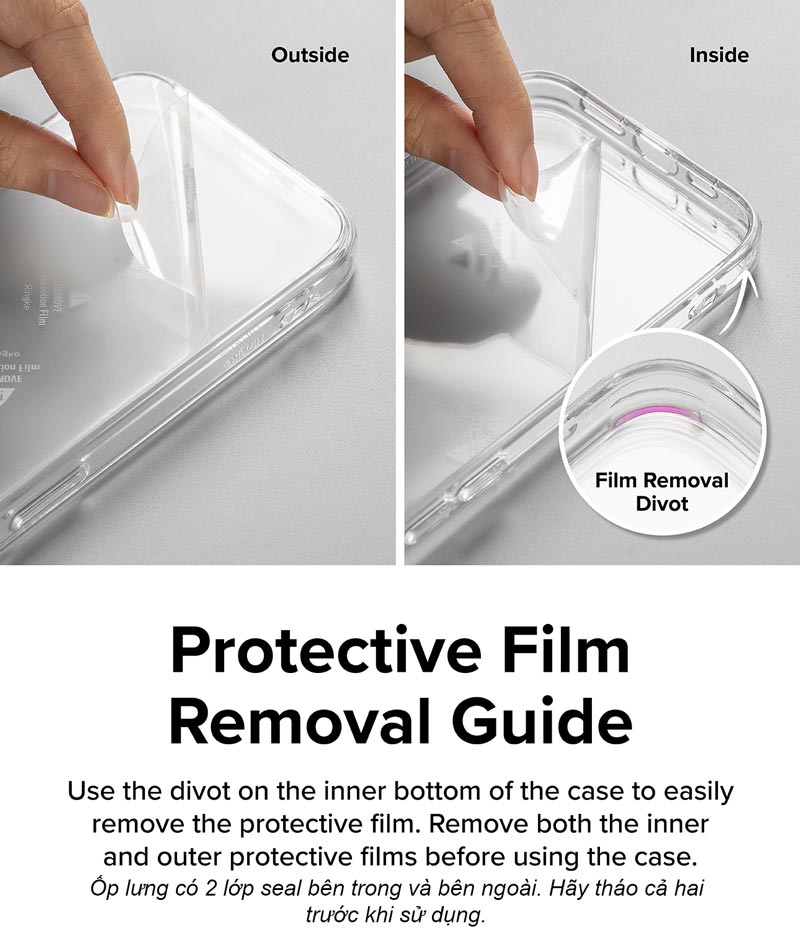 • Để đảm bảo vừa khít tốt nhất, nên gắn và tháo ốp lưng bắt đầu từ vị trí camera. Nếu thiết bị có dán bảo vệ camera như dán Ringke Lens Frame Glass, hãy thận trọng để không bị bung dán camera khi tháo ốp.