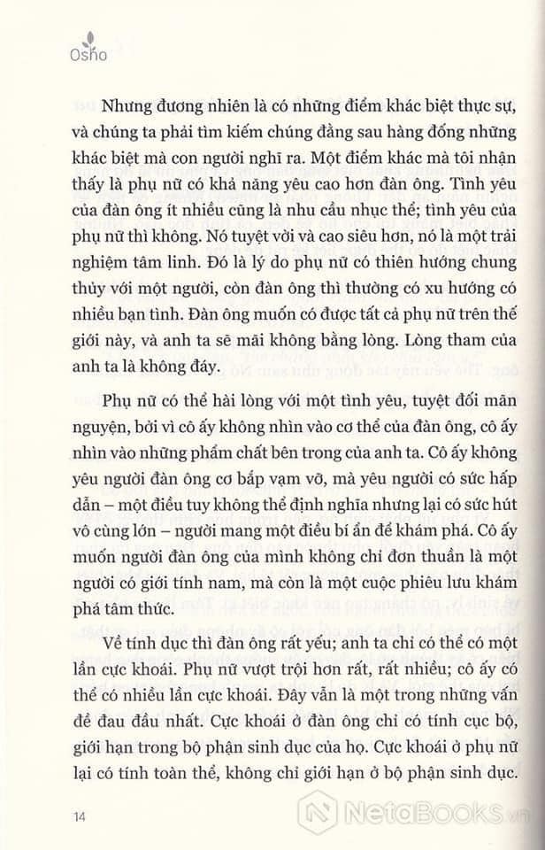Nếu người phụ nữ không được tự do để là một người phụ nữ thực sự, đàn ông cũng sẽ không bao giờ được tự do làm một người đàn ông đích thực. Tự do của phụ nữ là điều kiện bắt buộc cho tự do của đàn ông; nó có tính nền tảng hơn tự do của đàn ông. Và nếu phụ nữ là nô lệ – như mấy thế kỷ qua – cô ấy cũng sẽ biến đàn ông thành nô lệ, bằng những cách thức rất tinh vi. Cô ấy sẽ không chiến đấu trực tiếp với bạn; cách chiến đấu của cô ấy sẽ là gián tiếp, nó sẽ rất nữ tính. Cô ấy khóc lóc và sụt sùi. Cô ấy sẽ không đánh bạn, cô ấy sẽ tự đánh mình, và với những hành động như thế của cô ấy, đến người đàn ông mạnh nhất cũng sẽ bị xỏ mũi. Một người phụ nữ mình hạc xương mai có thể thống trị một người đàn ông rất lực lưỡng.