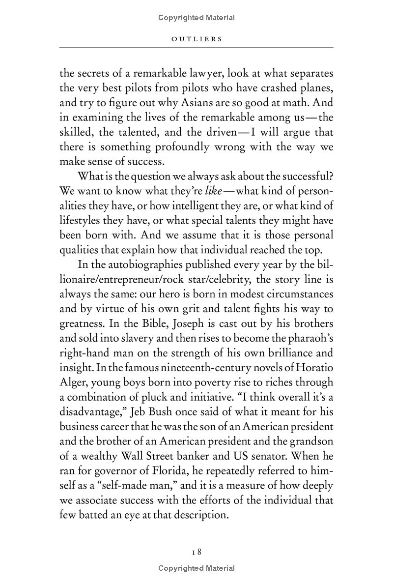 Why are people successful For centuries, humankind has grappled with this question. In this stunning new book, Gladwell takes us on an invigorating intellectual journey to show us what makes an overachiever. He reveals that we pay far too much attention to what successful people are like, and too little attention to where successful people are from: their culture, their family, and their generation. Gladwell examines how the careers of Bill Gates and the performance of world-class football players are alike; what top fighter pilots and The Beatles have in common; and why it is correct to say that the mathematician who solved Fermat's Theorem is not a genius