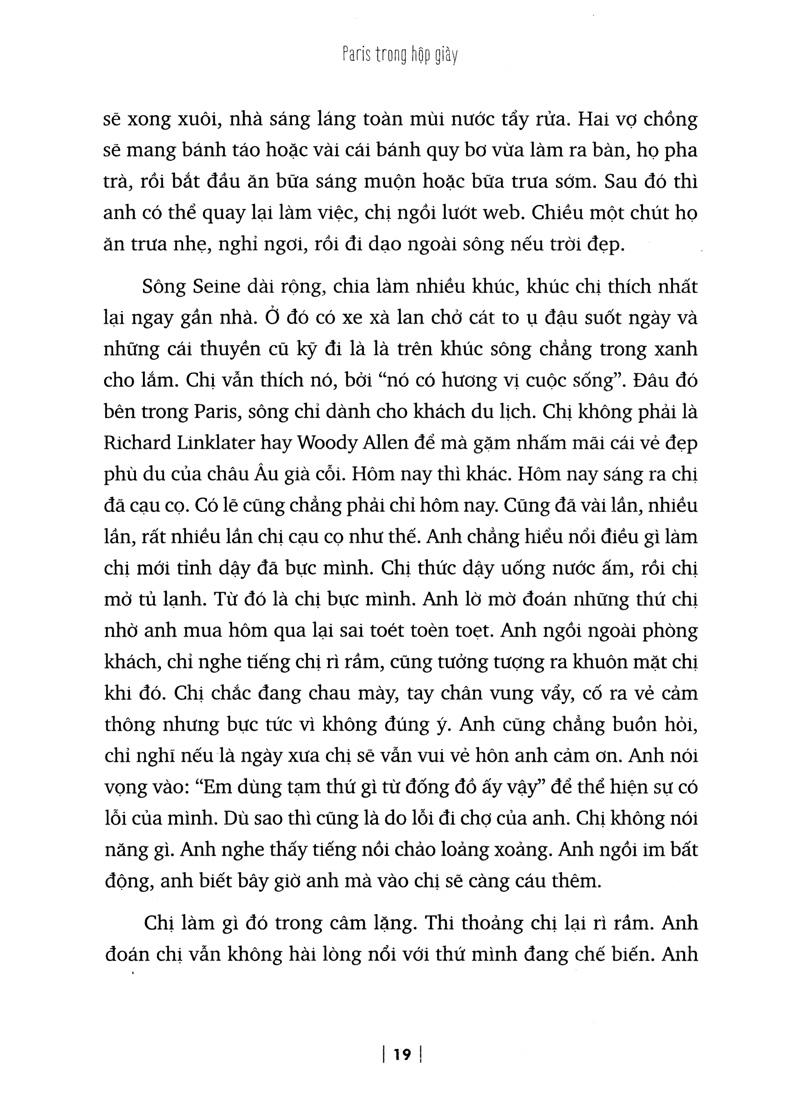 Những câu chuyện trong Paris trong hộp giày như được đựng trong một chiếc hộp đang chờ bạn đọc mở nắp. Dù có thể mang lại cảm giác khác nhau, sẽ là bức bối, chật chội như trong một chiếc hộp, hoặc thú vị, tươi tắn ùa ra trong những bất ngờ… nhưng vượt lên trên hết, khi “đóng nắp hộp” lại, chiếc hộp ấy không làm bạn đọc yêu văn chương thất vọng
