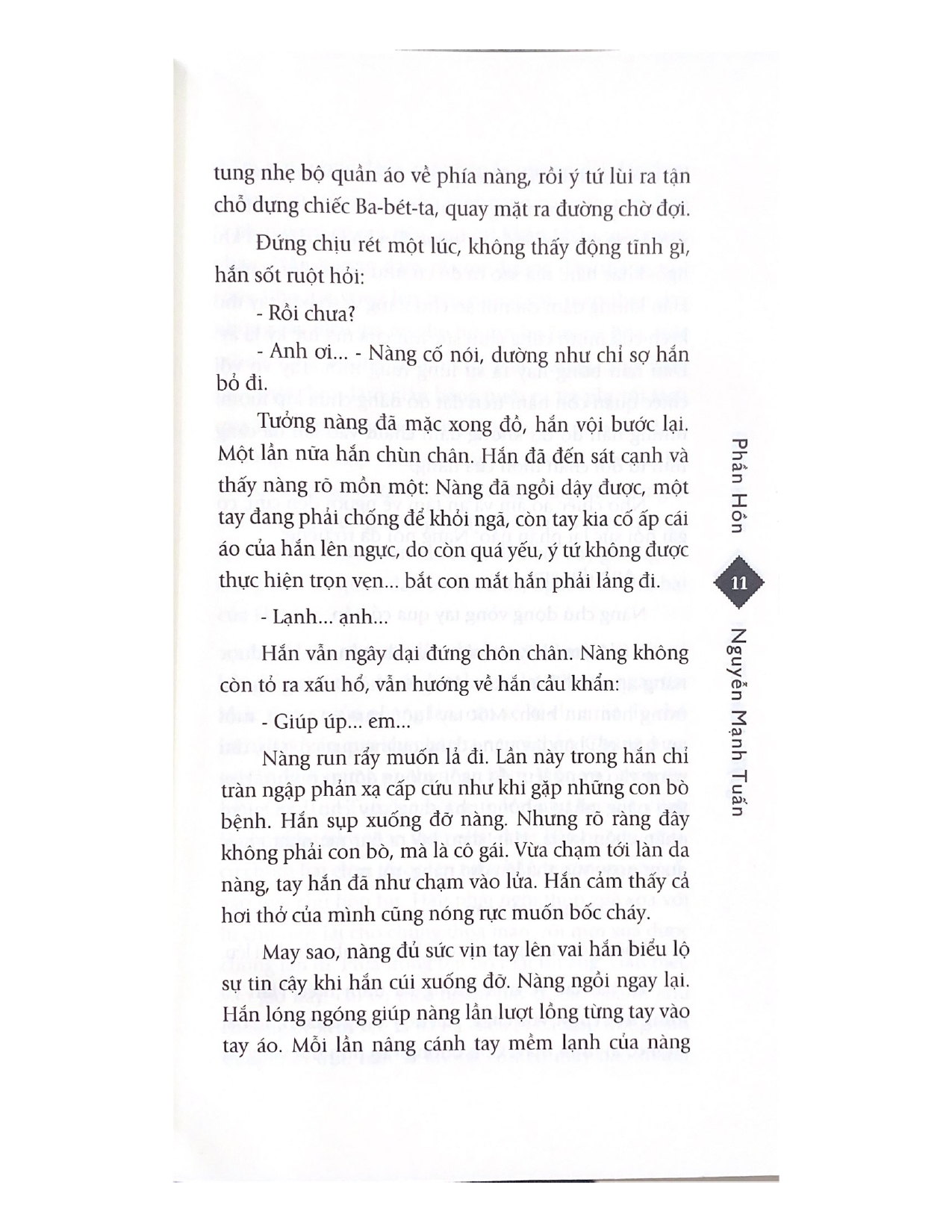 'Nàng ngấm sâu vào đời hắn bằng sự xuất hiện rất ngẫu nhiên, đã đánh thức trong hắn những nhận biết, những điều trước đây hắn tưởng không có trong phần hồn của người hắn, và chỉ từ mé phần hồn đó trỗi dậy cồn cào náo nức, hắn mới có nỗi khao khát làm một con người ra con người.