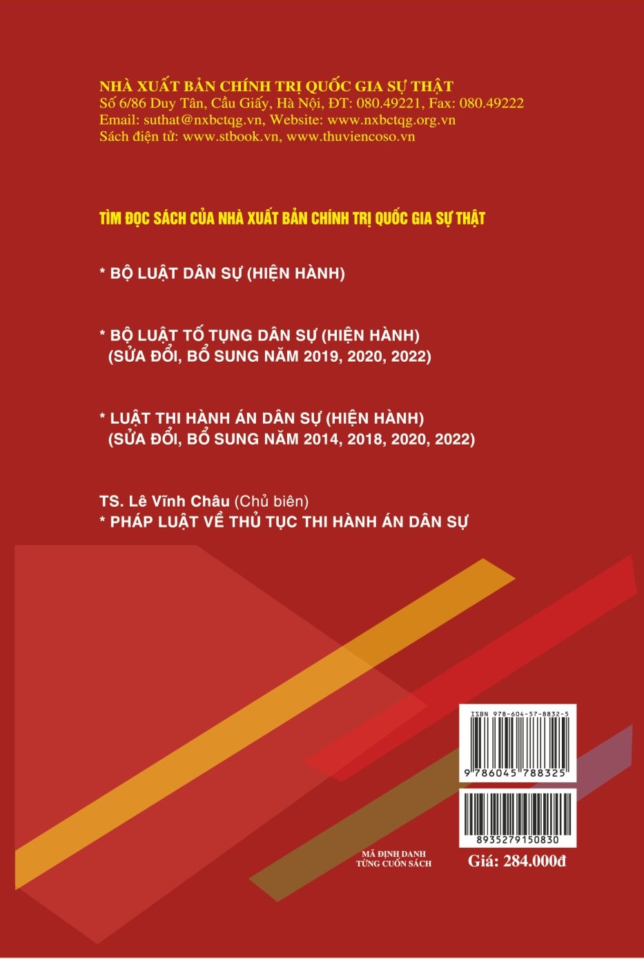 Pháp Luật Về Thủ Tục Thi Hành Án Dân Sự Tác giả: TS. Lê Vĩnh Châu (chủ biên) Nhà xuất bản: Chính Trị Quốc Gia Sự Thật Khổ sách: 16*24cm Phát hành: 8.2023 Công ty