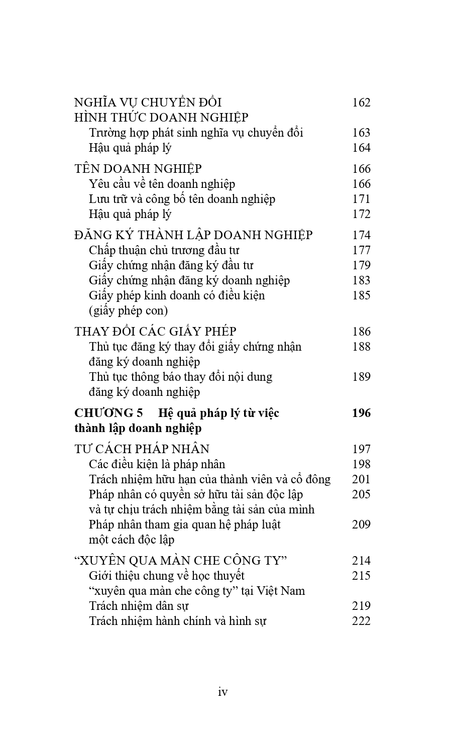 Trải dài trong hơn 1000 trang, cuốn sách phân tích các vấn đề pháp lý cơ bản liên quan đến việc thành lập, tổ chức quản lý và hoạt động của doanh nghiệp. Kết cấu của cuốn sách gồm hai mươi chương và chia làm năm phần, tập trung vào hai hình thức doanh nghiệp thông dụng nhất là công ty trách nhiệm hữu hạn (CTTNHH) và công ty cổ phần (CTCP).