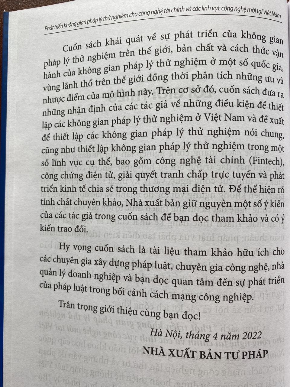 Từ những quan sát đó, nhóm làm việc của Viện Khoa học pháp lý và các chuyên gia từng cộng tác đã cùng nhau biên soạn cuốn sách: Phát triển không gian pháp lý thử nghiệm (Regulatory Sandbox) cho FinTech và các lĩnh vực công nghệ mới tại Việt Nam. Mục đích trước hết của cuốn sách này là cung cấp một nguồn tư liệu đáng tin cậy cho những người quản lý, các chuyên gia và công chúng về sự hình thành, phát triển, đặc điểm của các không gian pháp lý thử nghiệm, khả năng và những gợi ý cho việc thiết lập các không gian pháp lý thử nghiệm trong điều kiện ở Việt Nam. Mục đích này xuất phát từ mong muốn của chúng tôi là góp phần nhỏ bé của mình vào quá trình xây dựng, hoàn thiện pháp luật trong bối cảnh CMCN 4.0. Nhờ đó, Việt Nam có thể tận dụng được những sáng kiến về quản trị nhà nước đã được hình thành từ quá trình phát triển ở nhiều quốc gia trên thế giới như một cách để tận dụng được những thành tựu mới của cuộc cách mạng công nghệ.
