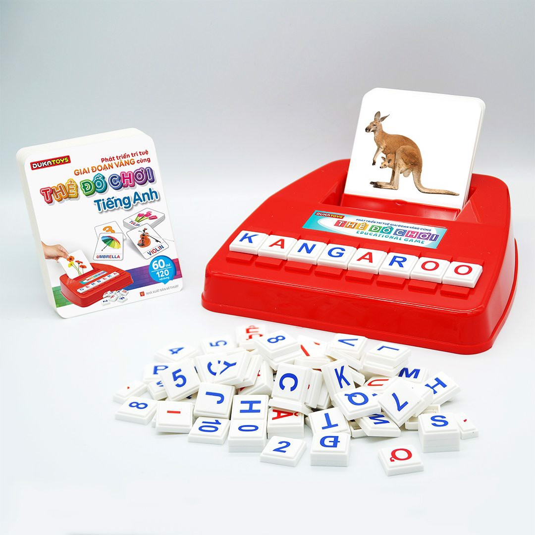 Phát triển trí tuệ giai đoạn vàng cùng thẻ đồ chơi         Các bậc cha mẹ có lẽ đã biết, giai đoạn vàng trong quá trình phát triển não bộ của trẻ là từ 0 - 6 tuổi. Trong khoảng thời gian này, nếu cha mẹ biết nắm bắt và cho con mình tiếp xúc, làm quen dần với ngôn ngữ và Toán học, sẽ có lợi vô cùng đối với quá trình phát triển trí tuệ của trẻ sau này. Hơn nữa, trong hành trình phát triển của con, vai trò của cha mẹ là vô cùng quan trọng. Việc cha mẹ cùng con học hỏi và từng bước tìm hiểu thế giới xung quanh sẽ giúp tình cảm cha mẹ và con thêm gắn kết, con sẽ thêm hào hứng và tự tin khám phá cuộc sống đầy mới mẻ.    Nắm bắt tâm thái ấy và nhằm hướng đến một thế hệ tương lai đầy triển vọng, Duka xin giới thiệu đến quý phụ huynh bộ thẻ thông minh với cách học đầy hứng thú và sáng tạo - " Phát triển trí tuệ giai đoạn vàng cùng thẻ đồ chơi". Theo đúng tiêu chí " Chơi mà học, học mà chơi", Duka hy vọng rằng cha mẹ sẽ dành thời gian hướng dẫn con, cùng chơi với con để trẻ thêm hào hứng tích lũy nền tảng kiến thức, trau dồi trí tuệ, hướng tới tương lai.  Hướng dẫn cách chơi:    Phụ huynh ngồi chơi cùng trẻ, chọn một tấm thẻ để trẻ quan sát sao cho trẻ không nhìn thấy phần chữ, số, hoặc phép toán bên dưới thẻ.   Phụ huynh hỏi thẻ tên gọi sự vật trên tấm thẻ, phân tích các hình ảnh hoặc hướng dẫn trẻ tư duy để tìm ra phép toán hợp lí.  Khi trẻ gọi đúng tên sự vật, hoặc nói đúng phép toán phù hợp với hình ảnh, phụ huynh hãy gợi ý trẻ ghép tên sự vật hoặc hoàn thành phép toán bằng cách tìm các chữ cái, các con số và dấu có trong dụng cụ đồ chơi rồi ghép lên phần đính hạt chữ ở hộp đồ chơi.   Cuối cùng, phụ huynh hãy kiểm tra xem trẻ có ghép đúng chữ cái hoặc phép toán như trên thẻ không?  Thông Tin Sản Phẩm