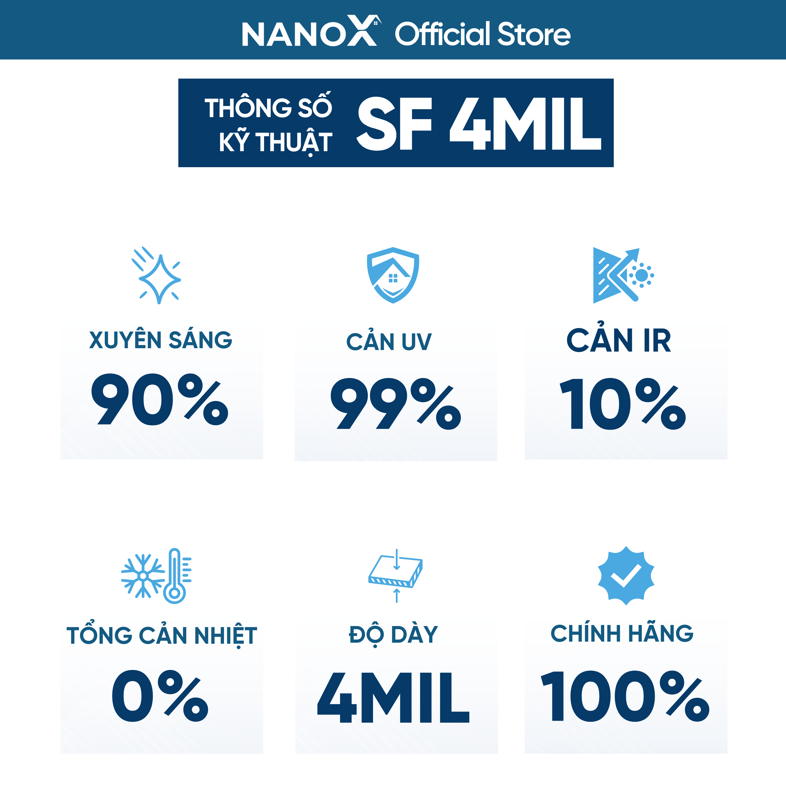 • Mỗi mã phim cách nhiệt sẽ có thông số kỹ thuật riêng dựa trên các nhu cầu khác nhau. Nếu gặp khó khăn trong lựa chọn, Quý khách vui lòng nhắn tin cho Shop. NanoX luôn sẵn sàng hỗ trợ, tư vấn giúp Quý khách chọn được mã phim phù hợp nhất.