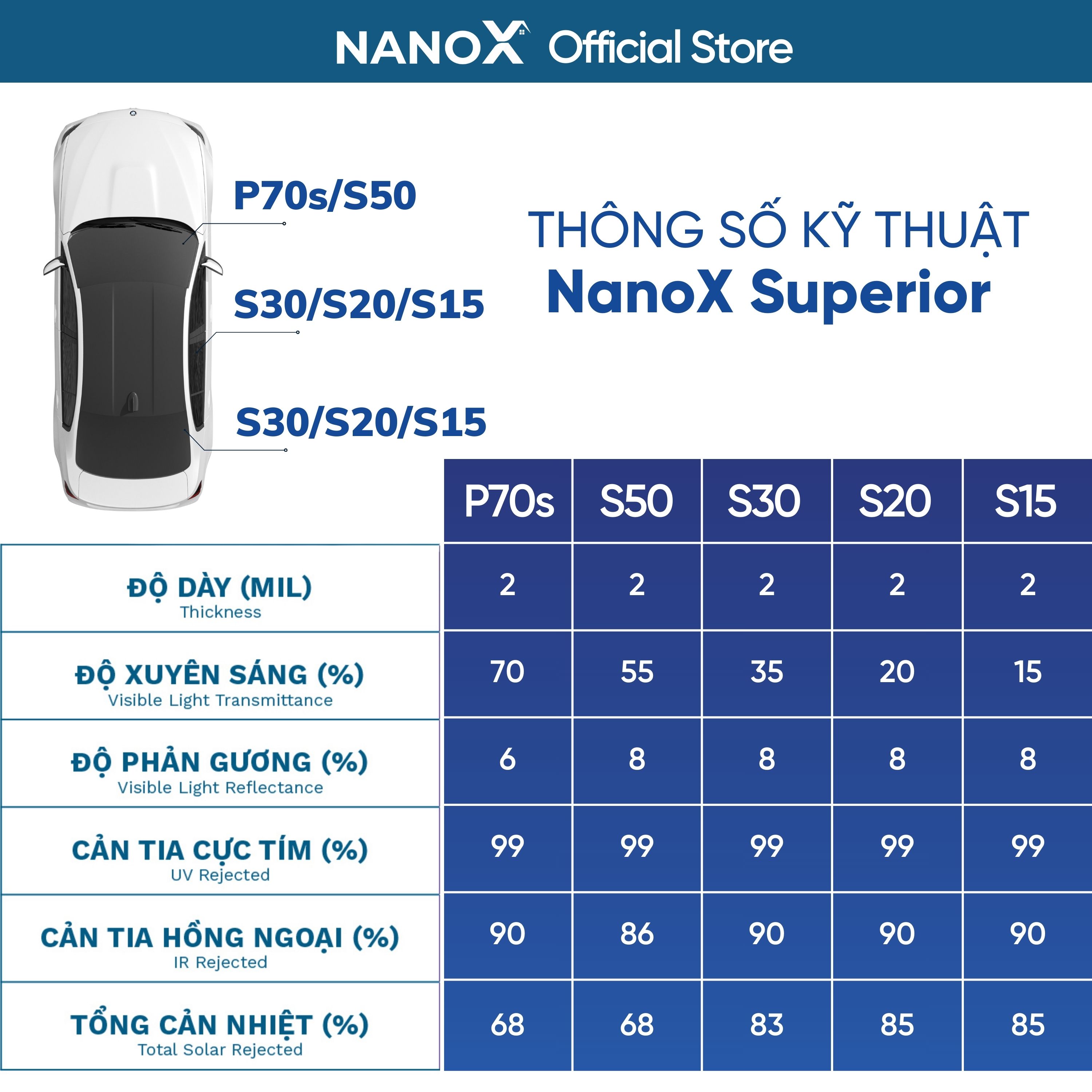 - Lợi ích: Không gian mát dịu, bảo vệ da - mắt & bảo vệ sức khoẻ, tầm nhìn rõ, giảm tải thiết bị làm mát (điều hoà) - tiết kiệm nhiên liệu, tăng cường riêng tư và an ninh… So sánh các gói NanoX Platinum - Premium – Superior – Standard