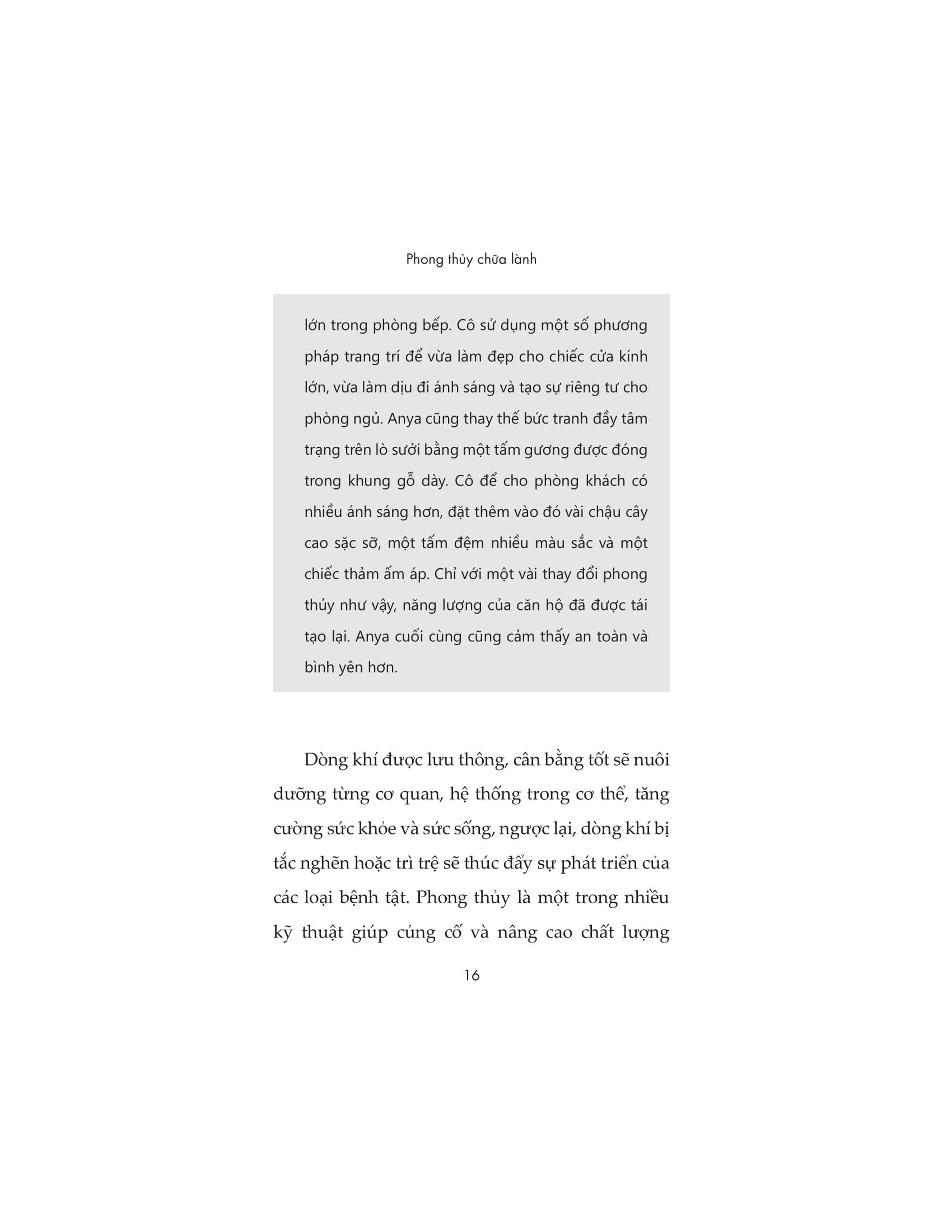 Thế giới rộng lớn và vô cùng phức tạp. Chúng ta gần như không thể kiểm soát được sự hỗn loạn liên tục của nó. Trong cuốn sách “Phong thủy chữa lành” sẽ cung cấp cho bạn cách áp dụng minh tuệ cổ xưa cho một ngôi nhà hiện đại. Xây dựng một ngôi nhà để che chở và chữa lành cho mỗi thành viên trong gia đình là bản chất của phong thủy.