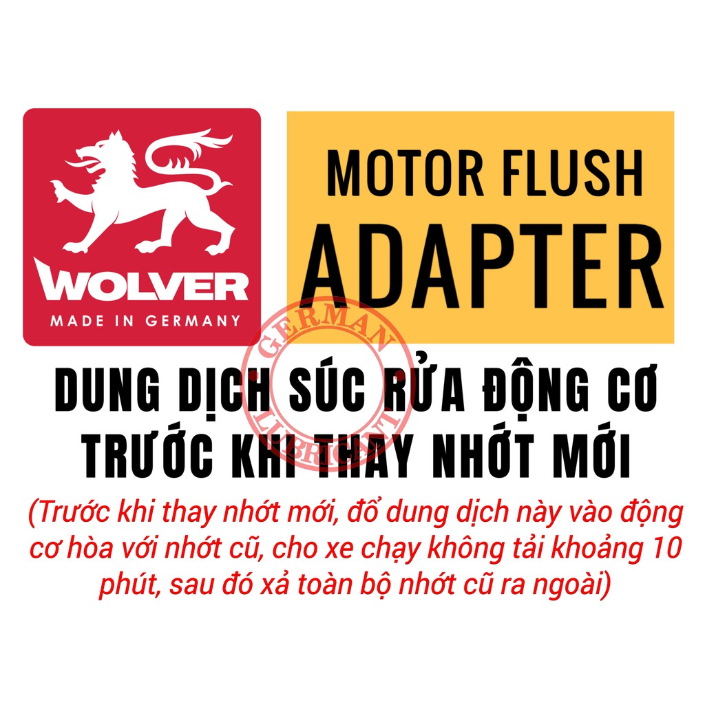 WOLVER MOTOR FLUSH ADAPTER là dung dịch dùng để súc rửa, làm sạch an toàn động cơ trước khi thay nhớt mới hoặc khi chuyển đổi loại nhớt. Hệ chất tẩy rửa đã được cấp bằng sáng chế độc quyền của WOLVER MOTOR FLUSH đảm bảo làm sạch tối ưu và loại trừ các tác nhân gây hại còn sót lại trong nhớt cũ trước khi thay nhớt mới.