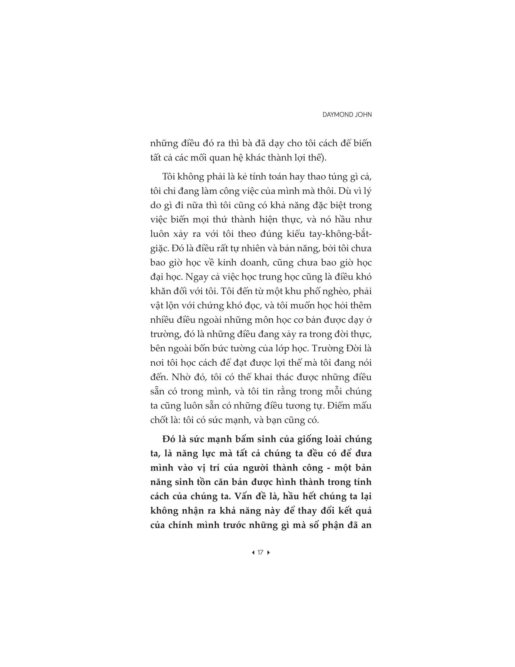 - Các mối quan hệ tạo nên sự kết nối lâu dài: Hãy nuôi dưỡng những kết nối mà bạn tạo ra trong suốt chặng đường. Thông qua những câu chuyện chưa từng được kể trong cuộc đời và sự nghiệp của m.ình, Daymond chia sẻ những bài học đưa ông đến vị trí như ngày hôm nay: từ cách ông làm lại hình ảnh trước công chúng khi chuyển từ ông trùm quần áo sang nhân vật truyền hình, đến cách ông nắm vững các chiến lược đàm phán. Tất cả những bí quyết quyết định các giao dịch thắng hay thua trong thế giới của các Shark, cũng như những bí mật của ông ấy trong việc xây dựng mối quan hệ lâu dài và có lợi với những người sáng lập và thương hiệu sẽ được tiết lộ trong sách. Xuyên suốt cuốn sách, một số nhân vật thành công nhất thế giới tiết lộ cách họ thay đổi quyền lực của m.ình theo những cách ấn tượng, như ngôi sao Kris Jenner, tỷ phú Mark Cuban, rapper Pitbull. Cho dù bạn là một nhà đổi mới đang nỗ lực biến ý tưởng lớn của m.ình thành hiện thực, một chuyên gia đang mong muốn được thăng chức hay một phụ huynh bận rộn đang cố gắng tìm thêm thời gian để tập trung vào những gì thực sự quan trọng với m.ình, Daymond sẽ chỉ cho bạn cách thay đổi sức mạnh và năng lượng hướng tới sự thay đổi tích cực.