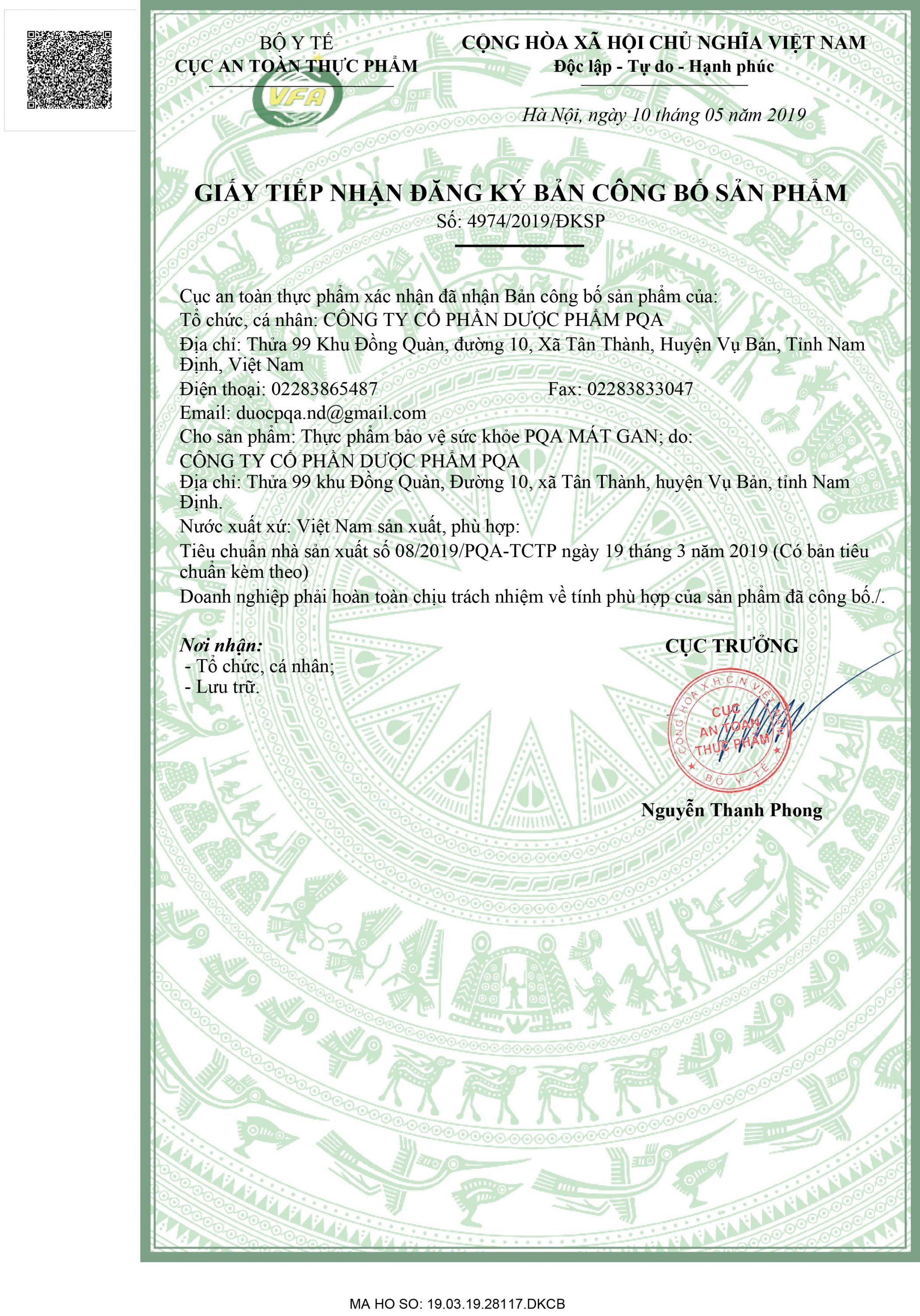 - Địa chỉ sản xuất: Công ty Cổ phần Dược phẩm PQA. Thửa 99, Khu Đồng Quàn, Xã Tân Thành, Huyện Vụ Bản, Tỉnh Nam Định. THÀNH PHẦN: