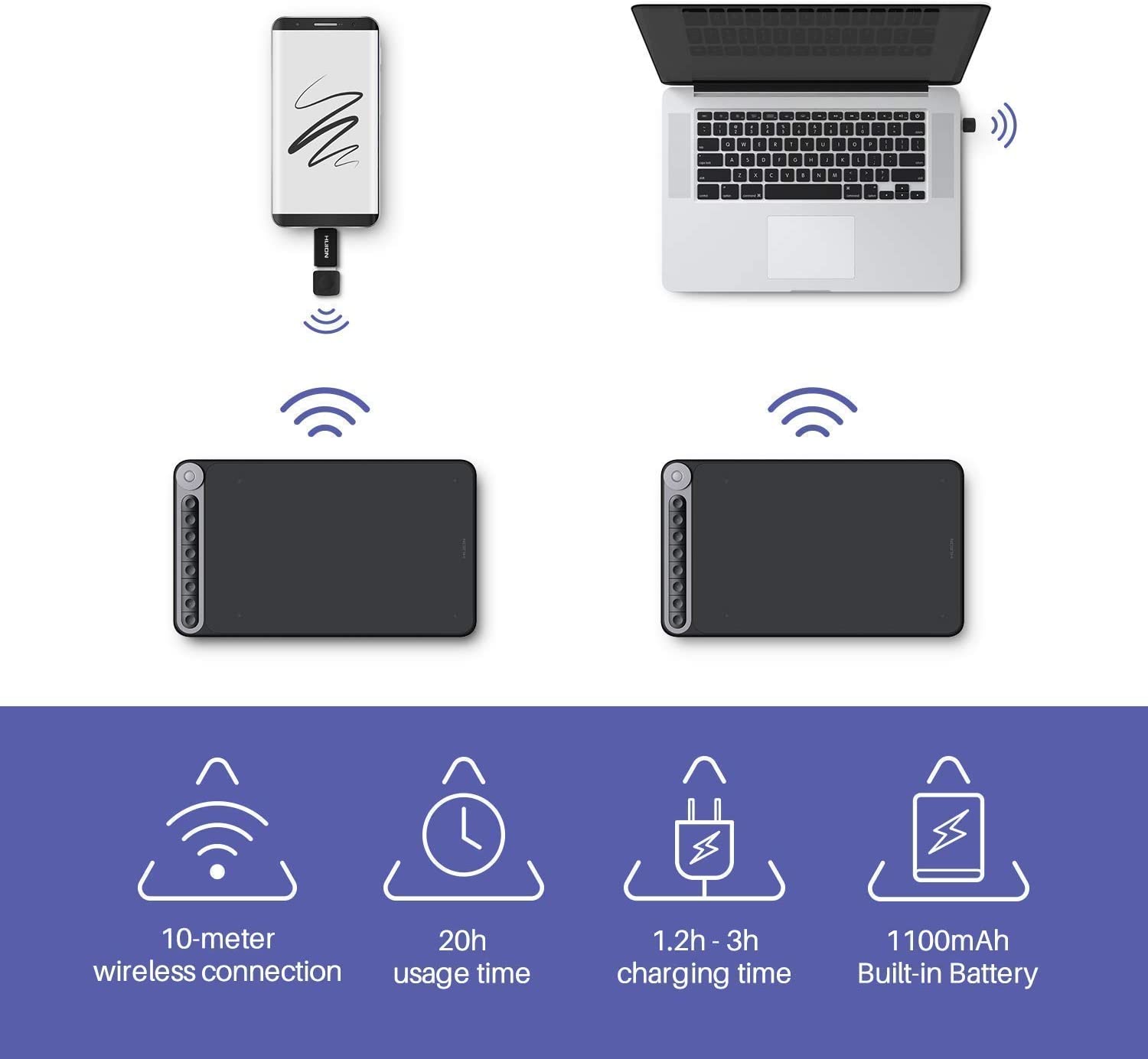 - Convenient wireless connection,amazing battery life. With an USB 3.4G wireless reeiver, Inspiroy Dial frees you from bundles of data cables, which ensure you a free-form drawing without limitation. Inspiroy Dial can be charged via 5V 500mA or 5V 1A power supply, and get a full charge, 20 hours of use, from a 1.2-hour quick charge with 5V 1A power supply.