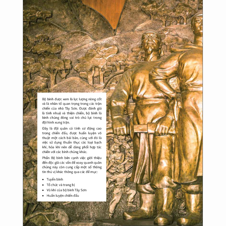 Quân đội Tây Sơn dưới sự lãnh đạo của thiên tài quân sự Quang Trung - Nguyễn Huệ đã giành nhiều chiến thắng lẫy lừng. Độc giải từng nghe nhiều về trận Rạch Gầm - Xoài Mút hay chiến dịch đại phá quân Thanh, nhưng nguyên nhân đằng sau những chiến thắng đó thì ít ai hiểu rõ. Sách giúp mổ xẻ những chiến thắng đó bằng những thông tin và gần 250 hình ảnh minh họa từ những nguồn tư liệu trong và ngoài nước. Ngoài tư duy quân sự cách tân, những chiến thuật mưu trí và sự xông pha đi đầu trong trận mạc của Nguyễn Huệ, quân đội với tổ chức quy củ và hiện đại gồm bộ binh, tượng binh, thủy binh, lực lượng có sự tham gia đông đảo của người Thượng, người Chăm, vũ khí sử dụng hỏa khí là trung tâm đã giúp quân đội Tây Sơn có được sức mạnh vượt trội. Sách bao gồm 175 tranh ảnh lịch sử, 73 ảnh hiện vật vũ khí, 3 video khám phá thêm.