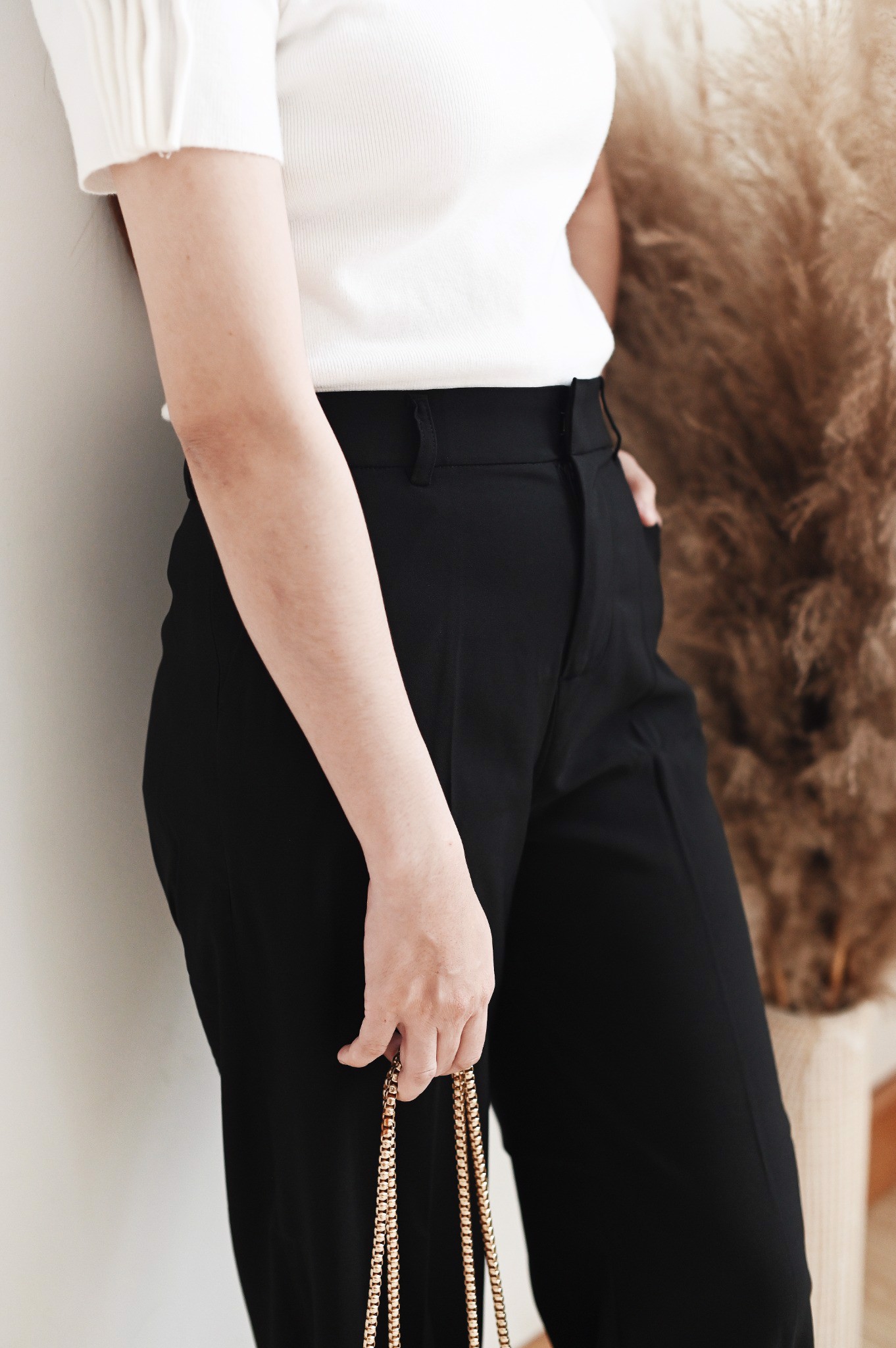 CHẤT LIỆU KAKI TÂY, DÀY DẶN ĐỨNG FORM QUẦN MÀU ĐEN FORM QUẦN ỐNG ĐỨNG, SUÔN THẲNG TẠO ĐÔI CHÂN DÀI PHẦN LAI QUẦN XẺ HAI BÊN TAG LOGO GẮN NGAY SƯỜN TÚI VÒNG EO