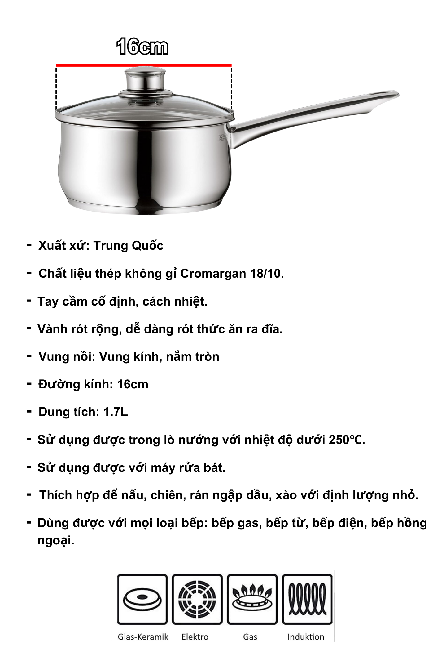 Quánh WMF DIADEM PLUS SAUCEPAN 16CM Đáy Từ 3 Lớp Nguyên Khối Có Nắp Dùng Cho Mọi Loại Bếp - 0739176040
