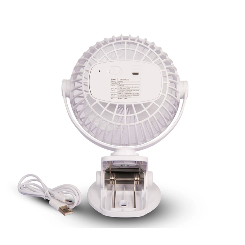 Mô tả sản phẩm Thông số kĩ thuật quạt kẹp bàn CRF0705: - Công suất 5W - Pin lithium-ion 3.7V 1800mAh - Điện áp 5V DC - Kích thước lồng quạt: 12.7 cm - 3