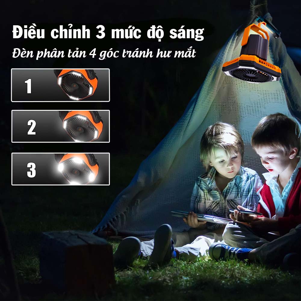ƯU ĐIỂM ️ Quạt di động: sử dụng quạt ở bất kỳ đâu mà không cần phải kết nối với nguồn điện trực tiếp hoặc trong trường hợp bị mất điện ️ Đèn: chiếu sáng trong những trường hợp mất điện, thêm vào đó đèn ở 4 góc còn giúp bảo vệ mắt, tránh cận thị ️ Cổng USB: Cắm sạc điện thoại, máy tính bảng, ️ Nút nháy đèn SOS: Dùng trong trường hợp khẩn cấp, đèn nháy liên tục để báo hiệu ️ Remote điều khiển từ xa: dễ dàng điều chỉnh ️ Tay cầm, móc treo: phù hợp để cầm theo mang đi cắm trại, dã ngoại, treo lều, chiếu sáng và quạt để nướng thịt buổi tối