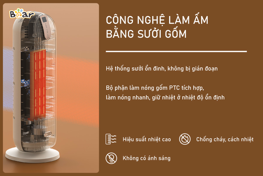 Quạt sưởi Bear DNQ-C20H5, không còn nỗi lo gặp sự cố như chập điện, cháy bỏng khi chạm vào, đổ ngã máy sưởi gây cháy nổ Công nghệ hiện đại được tích hợp trong quạt sưởi gốm Bear, đem đến sự tiện nghi và an toàn cho cả gia đình bạn.