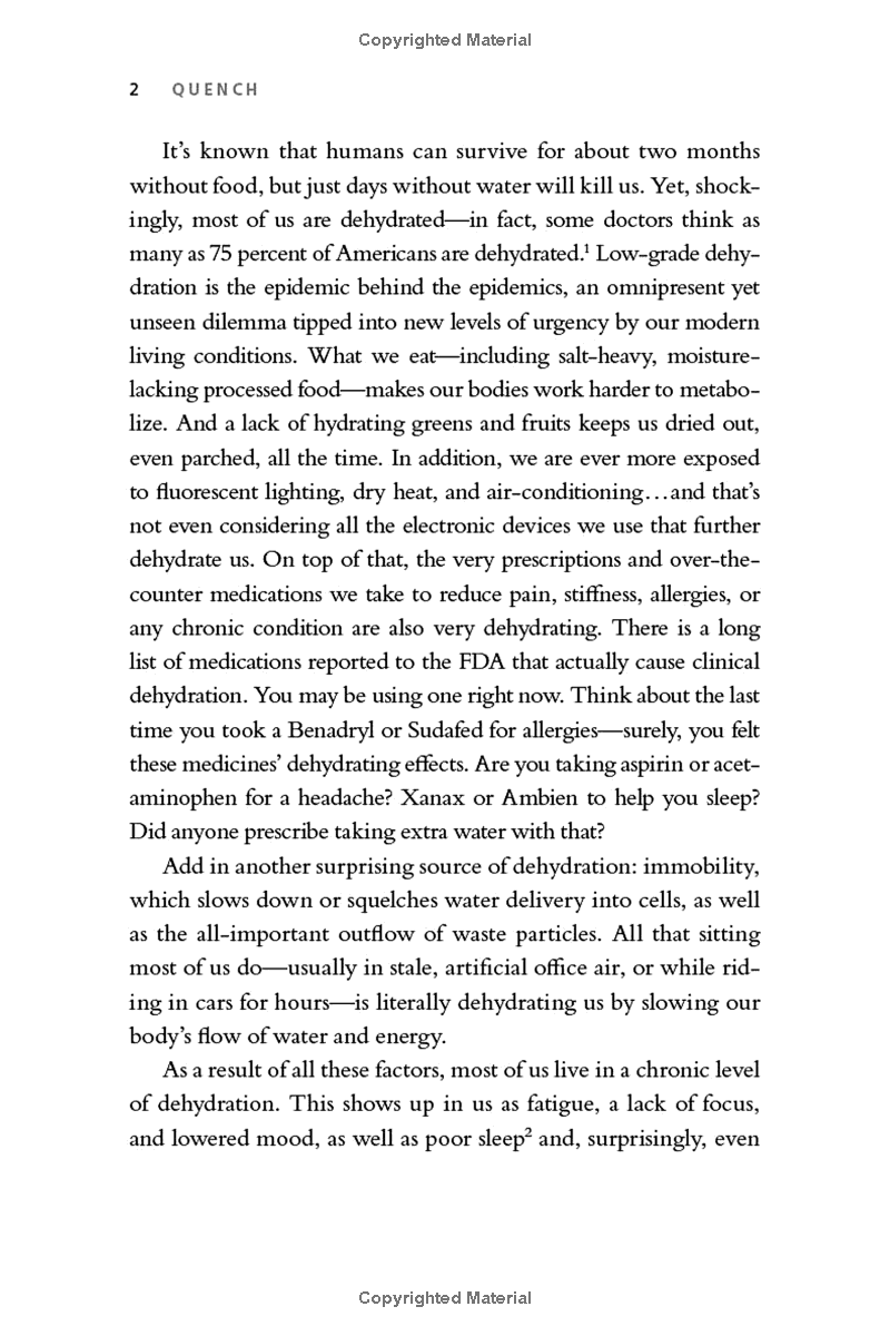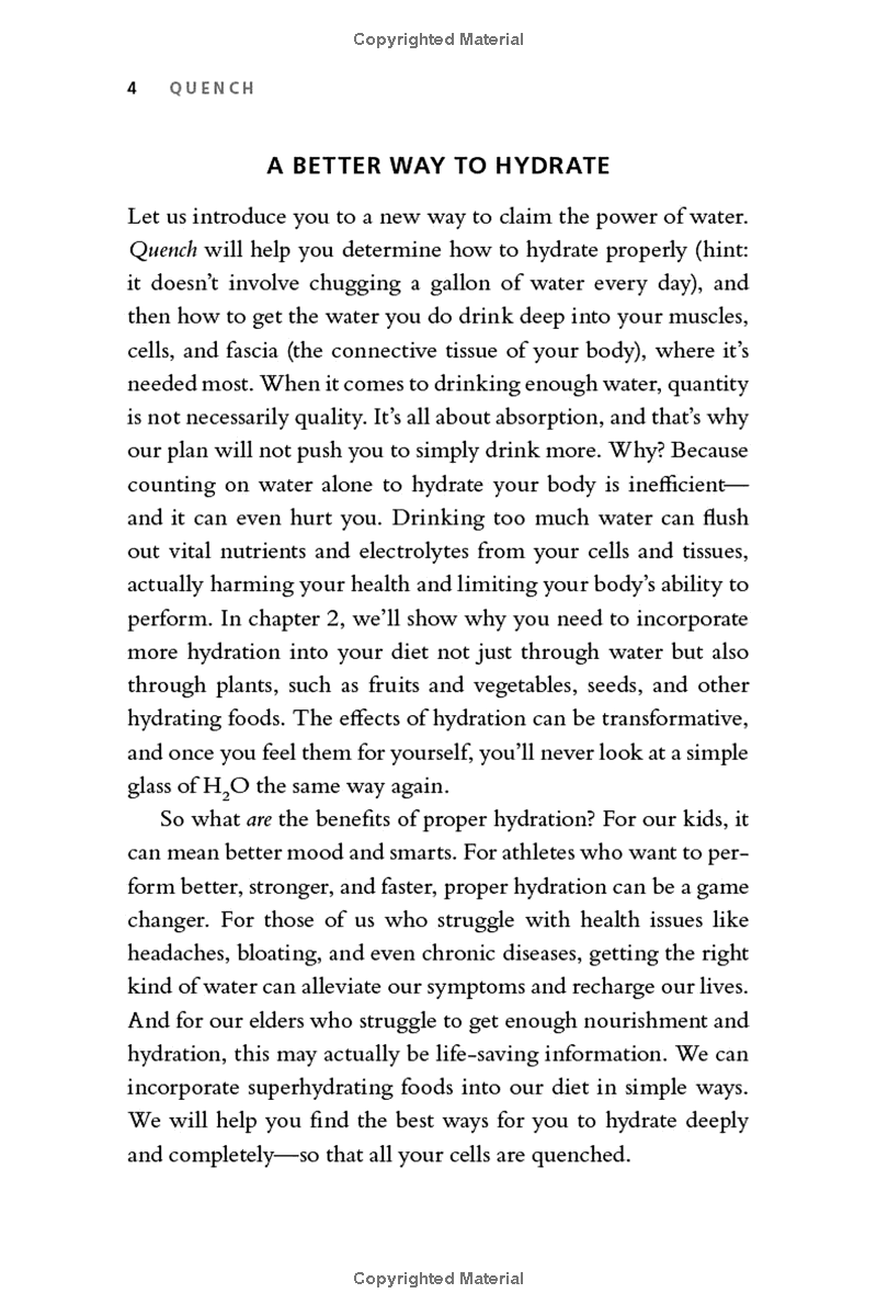 Based on groundbreaking science from the University of Washington's Pollack Water Lab and other research, Quench offers a five-day jump start plan: hydrating meal plans and the heart of the program, smoothies and elixirs using the most hydrating and nutrient-packed plants. Another unique feature of their approach is micro-movements -- small, simple movements you can make a few times a day that will move water through your fascia, the connective tissue responsible for hydrating our bodies. You will experience more energy, focus, and better digestion within five days . . . then move onto the lifetime plan for continued improvements, even elimination of symptoms.