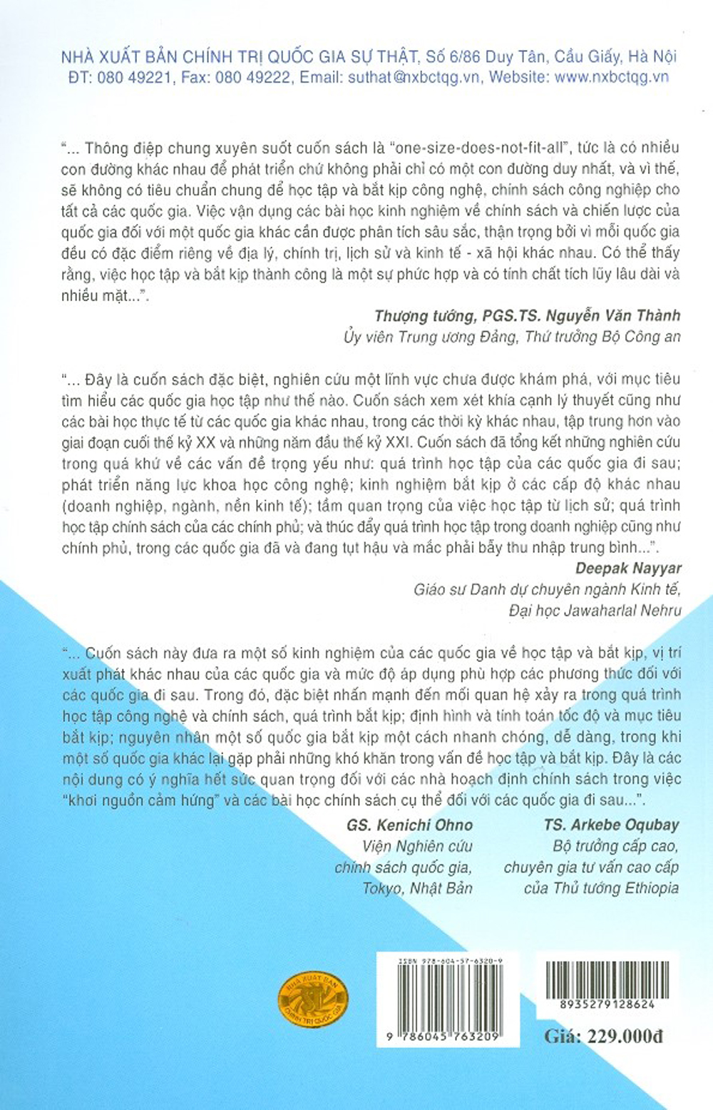 Mua tại Tiktok“ Cuốn sách này đưa ra một số kinh nghiệm của các quốc gia về học tập và bắt kịp, vị trí xuất phát khác nhau của các quốc gia và mức độ áp dụng phù hợp các phương thức đối với các quốc gia đi sau. Trong đó, đặc biệt nhấn mạnh đến mối quan hệ xảy ra trong quá trình học tập công nghệ và chính sách, quá trình bắt kịp; định hình và tính toán tốc độ và mục tiêu bắt kịp; nguyên nhân một số quốc gia bắt kịp một cách nhanh chóng, dễ dàng, trong khi một số quốc gia khác lại gặp phải những khó khăn trong vấn đề học tập và bắt kịp. Đây là các nội dung có ý nghĩa hết sức quan trọng đối với các nhà hoạch định chính sách trong việc "khơi nguồn cảm hứng” và các bài học chính sách cụ thể đối với các quốc gia đi ".