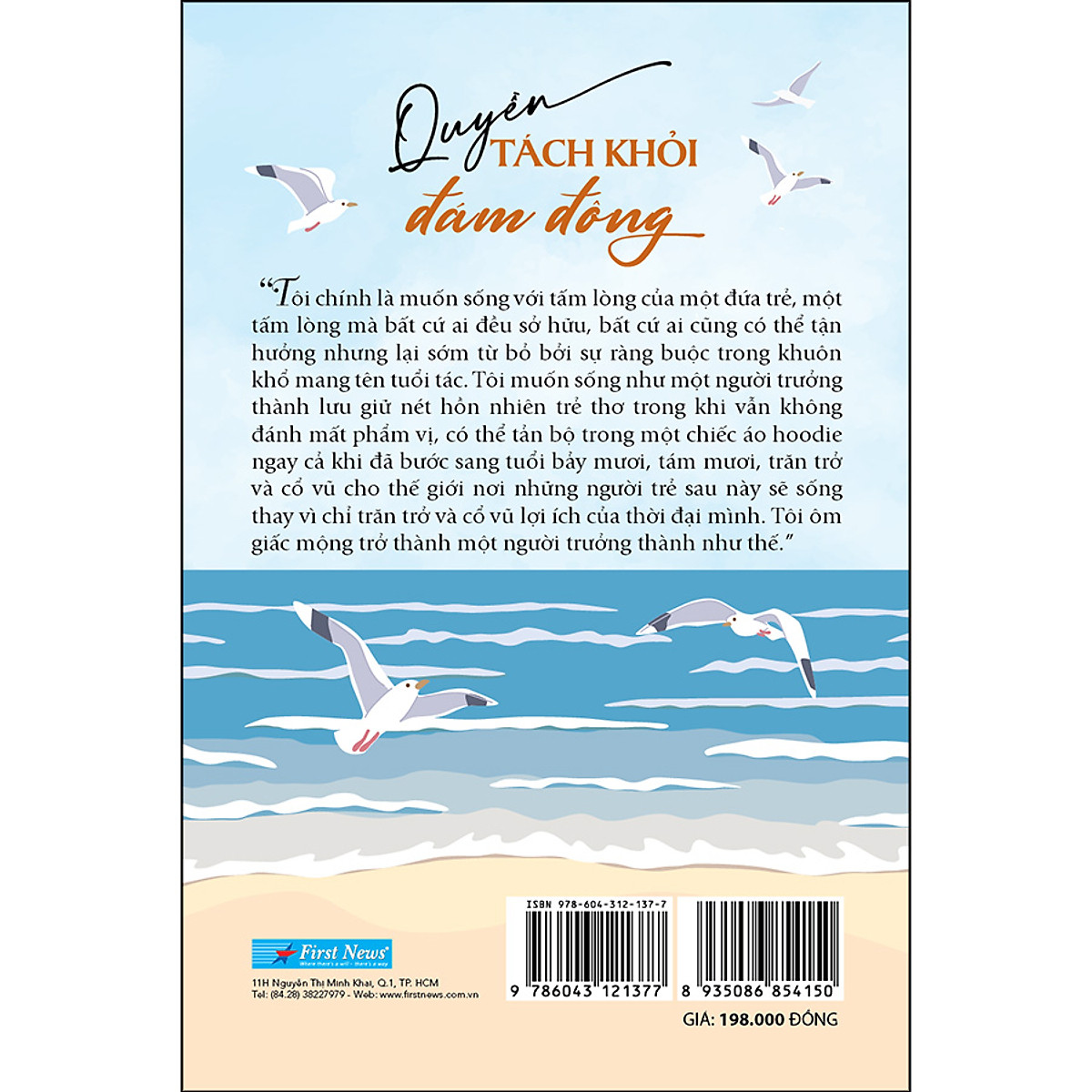 “Hạnh phúc không phải là đợi cho đến khi bạn kiếm được thật nhiều tiền và có một cuộc sống ổn định; nó cũng chẳng phải là khi bạn đã trả hết các khoản nợ và sắm những món đồ mới; lại càng không phải là khi những đứa trẻ đều đã trưởng thành và tìm được bến đỗ bình yên cho riêng chúng. […] Hạnh phúc là khi bạn dừng lại những tham vọng, lẫn sự bận bịu của con tim; chỉ thả lỏng tâm trí và dùng toàn bộ cơ thể để cảm nhận mọi sự diễn ra quanh mình. Hay nói cách khác, bạn sẽ cảm thấy hạnh phúc khi “không làm gì” cả” - chia sẻ của tác giả Heejae Jung trong “Quyền tách khỏi đám đông”.