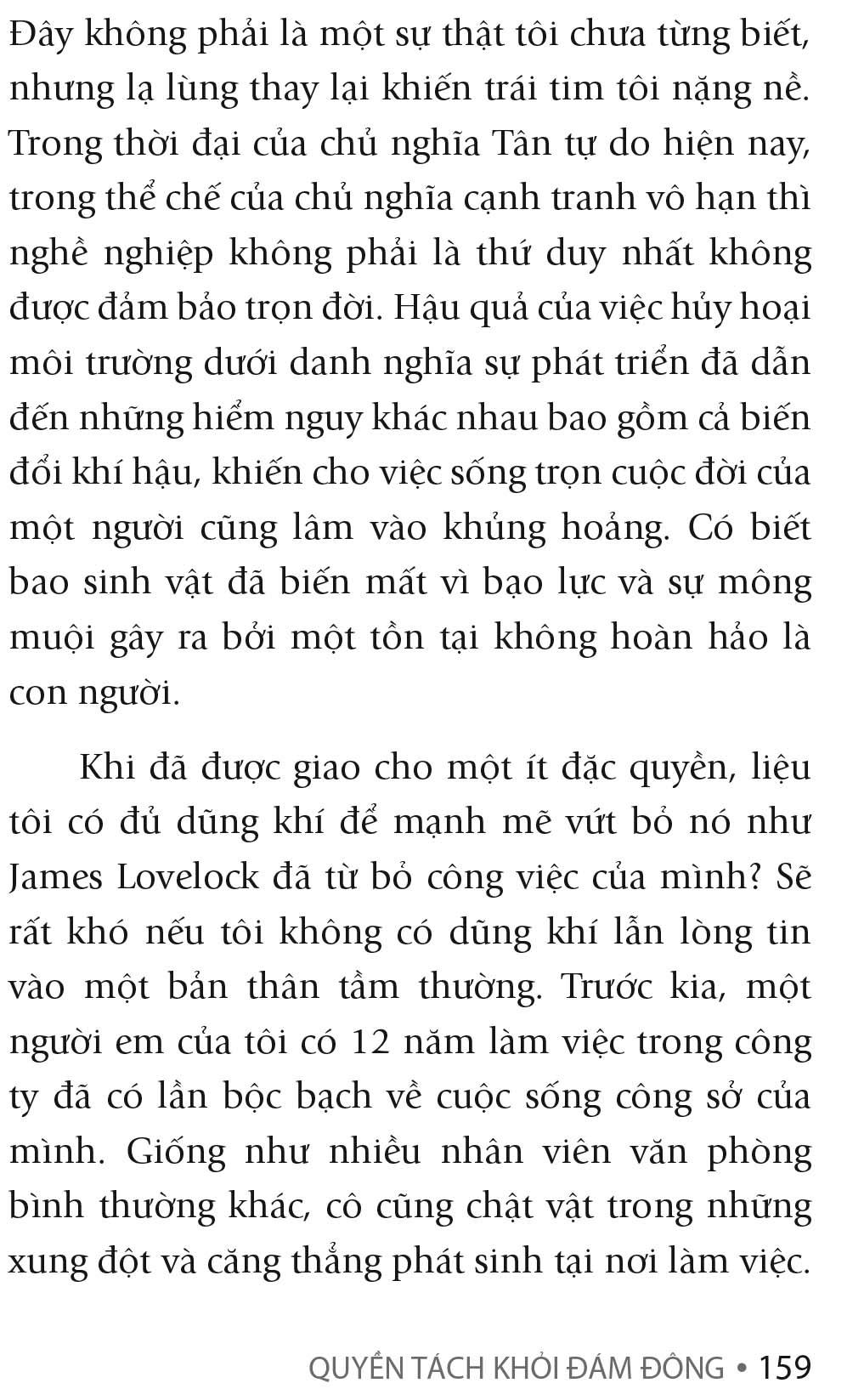 Với giọng văn mộc mạc nhưng không kém phần độc đáo trong cách lập luận và dẫn dắt, kết hợp cùng với những câu chuyện có thật trong đời thường của những người nổi tiếng như danh họa Vincent Van Gogh, hay nhà thám hiểm nhân sinh người Đức Heidemarie Schwermer, tác phẩm “Quyền tách khỏi đám đông” đã chạm đến tâm can của những ai đang mãi tất bật, loay hoay tìm kiếm sự hạnh phúc, giúp họ hiểu ra rằng: để có được điều đó, họ không cần phải làm hết tất cả, mà là “tĩnh lặng” cảm nhận hiện tại, vì khi đó, họ mới thực sự được trải nghiệm những vẻ đẹp và phép màu của cuộc sống này.