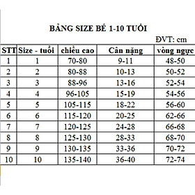 size 10: 135-140cm; 36-40kg; ngực 72-74cm