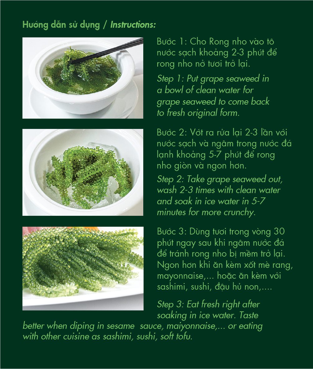 3 LÝ DO BẠN NÊN DÙNG SẢN PHẨM RONG NHO TRƯỜNG THỌ ? NGON NHẤT: - Rong Nho Trường Thọ có màu xanh tự nhiên đẹp nhất, giòn và ngon, không tanh và không hôi