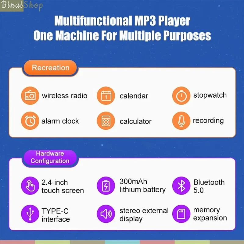 Màn hình: 1.8 inch TFT Độ phân giải màn hình: 126*160 Kích thước: 96*42*9.6mm Bộ nhớ: 8G Chức năng Bluetooth: Bluetooth 4.2. Hỗ trợ kết nối Bluetooth tai nghe và loa Bluetooth. Nhạc nền phát