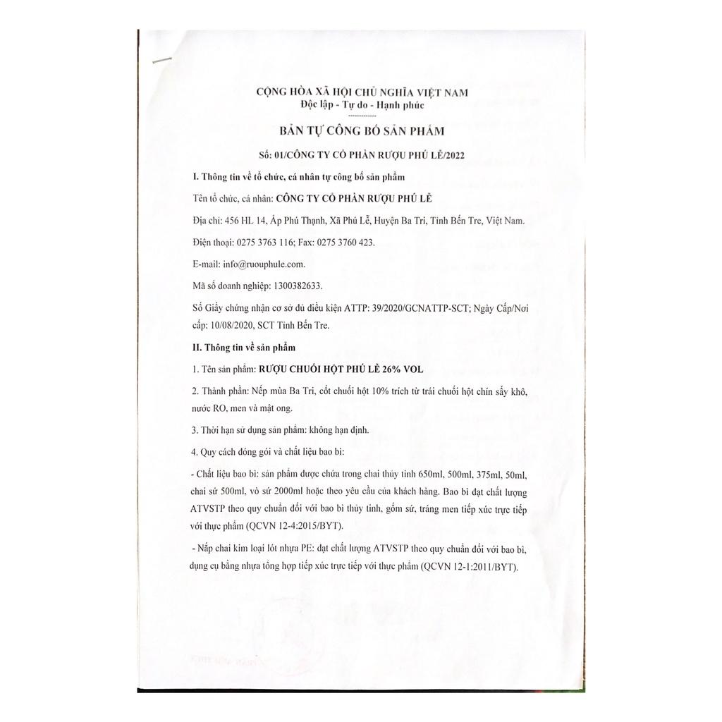 RƯỢU PHÚ LỄ - KHƠI BẢN SẮC, TOẢ TINH HOA RƯỢU VIỆT Công ty Cổ phần Rượu Phú Lễ là công ty sản xuất rượu Việt Nam có trụ sở chính tại số 456 HL 14, xã Phú Lễ, huyện Ba Tri, tỉnh Bến Tre. Sản phẩm của công ty được người tiêu dùng tin chọn là Hàng Việt Nam chất lượng cao trong nhiều năm liên tục (kể từ năm 2011 cho đến nay) RƯỢU CHUỐI HỘT PHÚ LỄ - ĐẬM ĐÀ HƯƠNG VỊ ĐẶC TRƯNG Với thành phần chính là Nếp mùa Ba Tri, loại nếp dài ngày thơm ngon bậc nhất miền châu thổ phù sa, cùng bài hồ men truyền thống Phú Lễ được làm từ 36 vị thảo mộc thiên nhiên quyện cùng vị chát dịu của Chuối Hột chín được chọn lựa kỹ càng, tạo nên dòng rượu vàng trong thơm mùi cỏ cây, từ lâu đã trở thành thức uống dân gian gắn liền với đời sống văn hóa của người dân Nam Bộ. Rượu Chuối Hột Phú Lễ có hậu vị ngọt, chát nhẹ; cho cảm giác the cay, ấm nồng; không gây đau đầu, khô cổ, mang lại cảm giác dịu êm sảng khoái. MÔ TẢ SẢN PHẨM Dung tích: 500ml Nồng độ cồn: 26% Vol Thành phần: nếp mùa Ba Tri, cốt chuối hột 10% trích từ trái chuối hột chín sấy khô, nước tinh khiết, men và mật ong Xuất xứ: Ba Tri, Bến Tre, Việt Nam Hướng dẫn sử dụng: thích hợp cho bàn tiệc từ 4-6 người HẠN SỬ DỤNG Không hạn định THƯỞNG THỨC CÓ TRÁCH NHIỆM Không chia sẻ nội dung này cho người dưới 18 tuổi