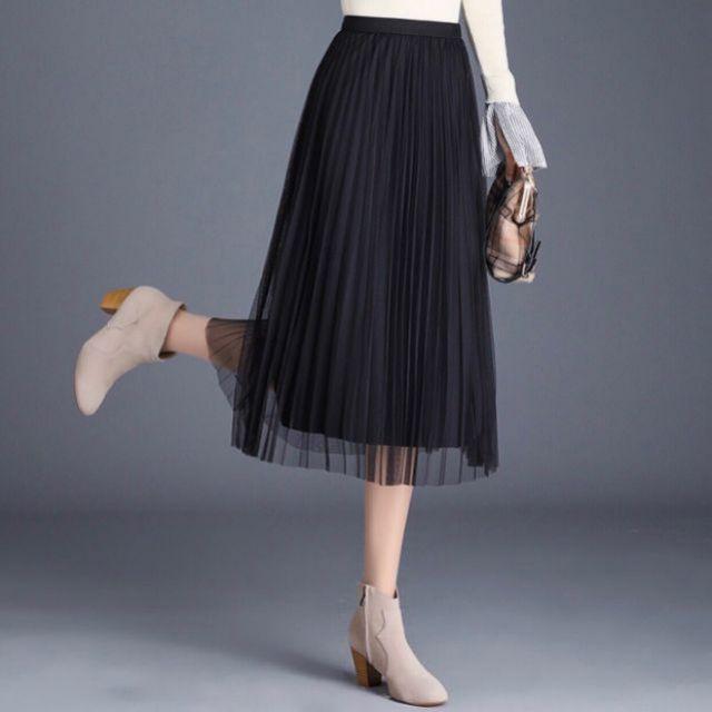 ₫159.000: Chân váy midi lưới Mia, chân váy xếp ly dài midi 2 lớp phối dây xích vintage