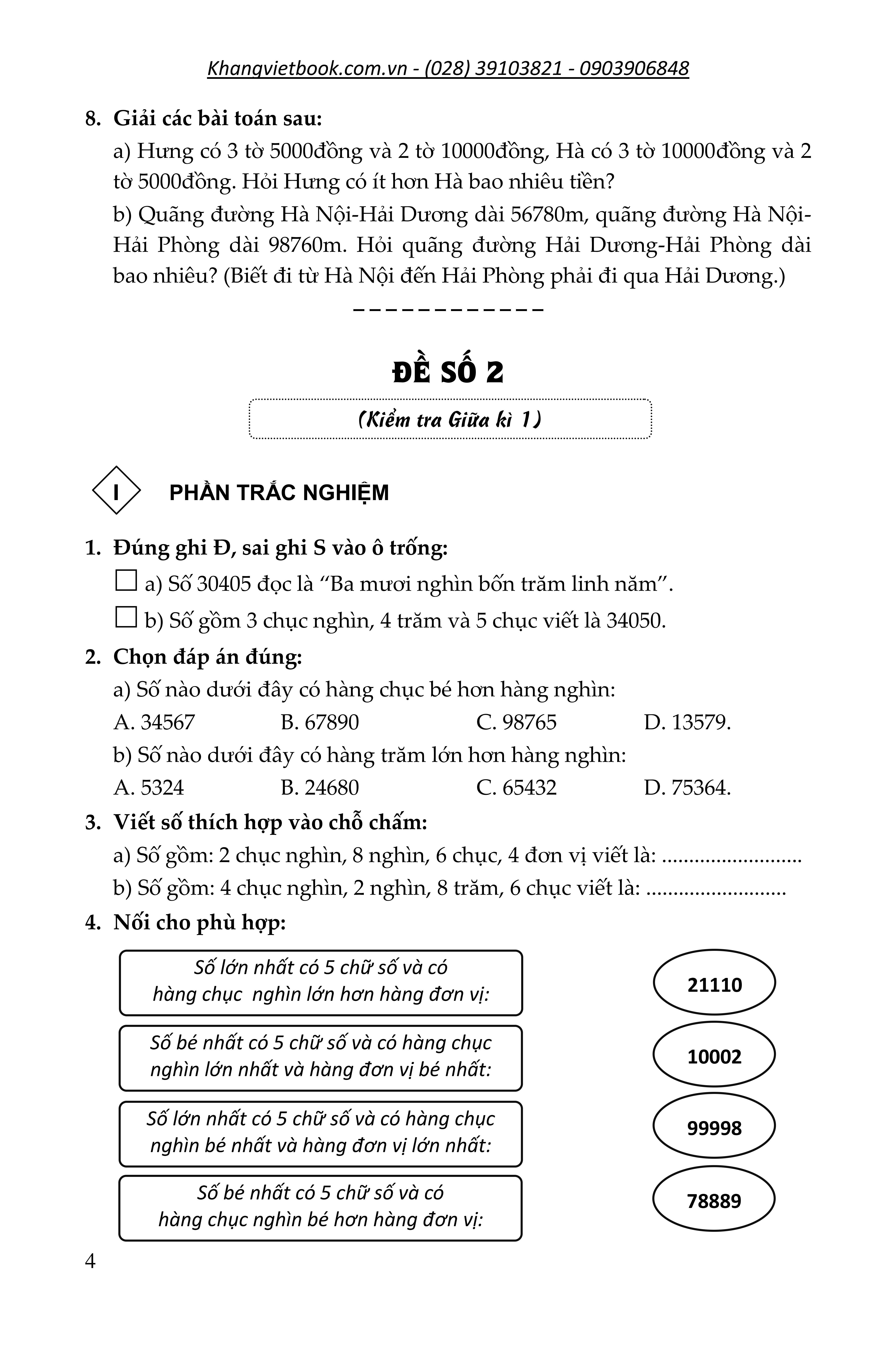 Combo Bộ Đề Kiểm Tra Môn Toán + Tiếng Việt Lớp 4 (Dùng Kèm SGK Kết Nối Tri Thức Với Cuộc Sống) (Bộ 4 Cuốn) 1. Bộ Đề Kiểm Tra Môn Toán Lớp 4 Tập