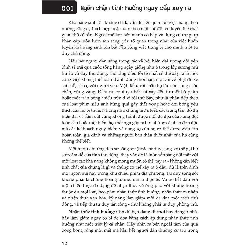 - Số trang: 272 100 KỸ NĂNG SINH TỒN – CUỐN CẨM NANG HƯỚNG DẪN VỀ CÁCH SỐNG SÓT Ở NƠI HOANG DÃ VÀ CHUẨN BỊ CHO MỌI THẢM HỌA Được viết bởi Clint Emerson – một cựu Đặc vụ SEAL, lực lượng tác chiến đặc biệt của Hải quân Hoa Kỳ, cuốn sách 100 kỹ năng sinh tồn của Đinh Tị Books là một trong những cuốn sách bán chạy của New York Times. Rõ ràng, chi tiết và được trình bày dễ hiểu, cuốn sách phác thảo những chiến lược cơ bản nhưng thiết thực giúp bảo vệ bản thân và thoát khỏi những tình huống khó khăn và nguy cấp nhất. Tác giả của cuốn sách là một cựu Đặc vụ SEAL, ông đã dành hai mươi năm chỉ đạo những chiến dịch đặc biệt trên khắp thế giới trong lúc còn gắn bó với Đội Ba SEAL, Cơ quan An ninh Quốc gia Hoa Kỳ (NSA), và Đội Sáu SEAL tinh nhuệ. Những kỹ năng bổ ích của cuốn sách "100 kỹ năng sinh tồn" như thế nào? Những kỹ năng được giới thiệu trong cuốn sách “mang tính sống còn” vì một lí do. Nhiều trong số đó được lấy cảm hứng từ những nhiệm vụ và sự huấn luyện đặc biệt của những đặc vụ thường xuyên bị đẩy đến giới hạn của sức chịu đựng, sự chuẩn xác và tài xoay xở khéo léo trong những điều kiện hiểm nghèo đe dọa đến tính mạng. Một xã hội ngày càng được kết nối toàn cầu đòi hỏi sự chỉ dẫn mới để tồn tại. Bạn sẽ làm gì nếu như một ngày bạn và những người thân yêu bị mắc kẹt giữa vùng lãnh thổ có dịch bệnh hoành hành, lạc ở nơi hoang dã, hay bị móc túi khi đi du lịch ở đất nước xa lạ? Bạn sẽ phản ứng ra sao khi bạn phải thoát ngay khỏi một vụ hỏa hoạn ở nhà cao tầng, bạn phải làm gì để cứu người thân đang mắc kẹt trong vụ hỏa hoạn đó…? Bản kế hoạch thu nhỏ? Tại sao không? Cuốn sách là một bản kế hoạch chi tiết đưa chúng ta trở về những cốt lõi của những kỹ năng đã mất, dạy chúng ta cách xác định phương hướng ở những nơi thiếu vắng các biển báo đường phố hay tín hiệu vệ tinh, đồng thời chuẩn bị cho chúng ta đối mặt với nhiều mối đe dọa mới xuất hiện trong môi trường mà chúng ta đang sống. Rõ ràng, chi tiết và được trình bày dễ hiểu, cuốn sách phác thảo nhiều chi tiết chiến lược giúp bảo vệ bạn và những người bạn yêu thương vượt qua những tình huống khó khăn, nguy hiểm nhất với một sự chuẩn bị cả về vật chất và tinh thần bình tĩnh. Cuốn sách dạy bạn cách suy nghĩ và hành động như một thành viên của lực lượng quân đội tinh nhuệ Hoa Kỳ. Kết Luận Chỉ những sinh vật mạnh mẽ mới có thể sống sót, chỉ những người thông thạo và hiểu biết mới có thể phát triển. Thế giới này chưa từng trở nên an toàn hơn, vì vậy bạn hãy sẵn sàng để luôn đứng vững. Và hãy để cho cuốn sách “100 kỹ năng sinh tồn” chỉ đường cho bạn.