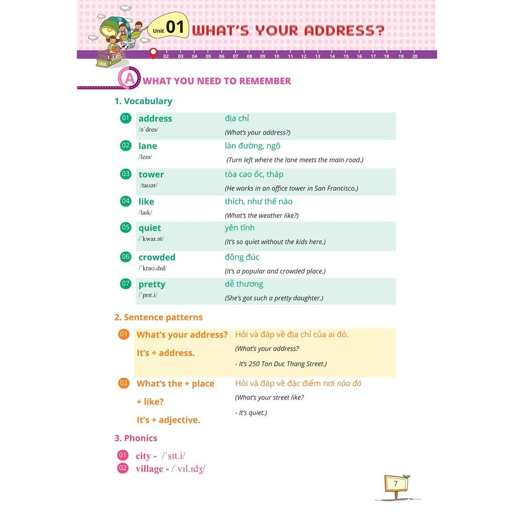 - Cấu trúc bài học chặt chẽ – Ôn tập toàn diện, ghi nhớ nhanh A. Kiến thức cần nhớ – What you need to remember Phần lý thuyết ngắn gọn, giúp các em ôn tập toàn bộ kiến thức từ vựng, cấu trúc và ngữ âm theo mỗi unit trên lớp B. Bài kiểm tra tổng hợp – Let’s put your memory to the test Bài kiểm tra tổng hợp các dạng bài tập thực hành: Trắc nghiệm chọn câu đúng, nghe và điền từ, tìm lỗi sai, nối, hoàn thành câu… C. Đáp án – Answer key Đáp án và lời giải chi tiết cuối sách giúp các em tự đánh giá lại mức độ thông hiểu và ghi nhớ, khắc sâu thêm kiến thức