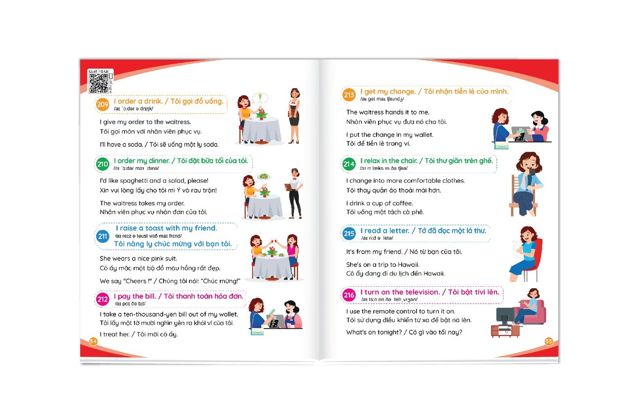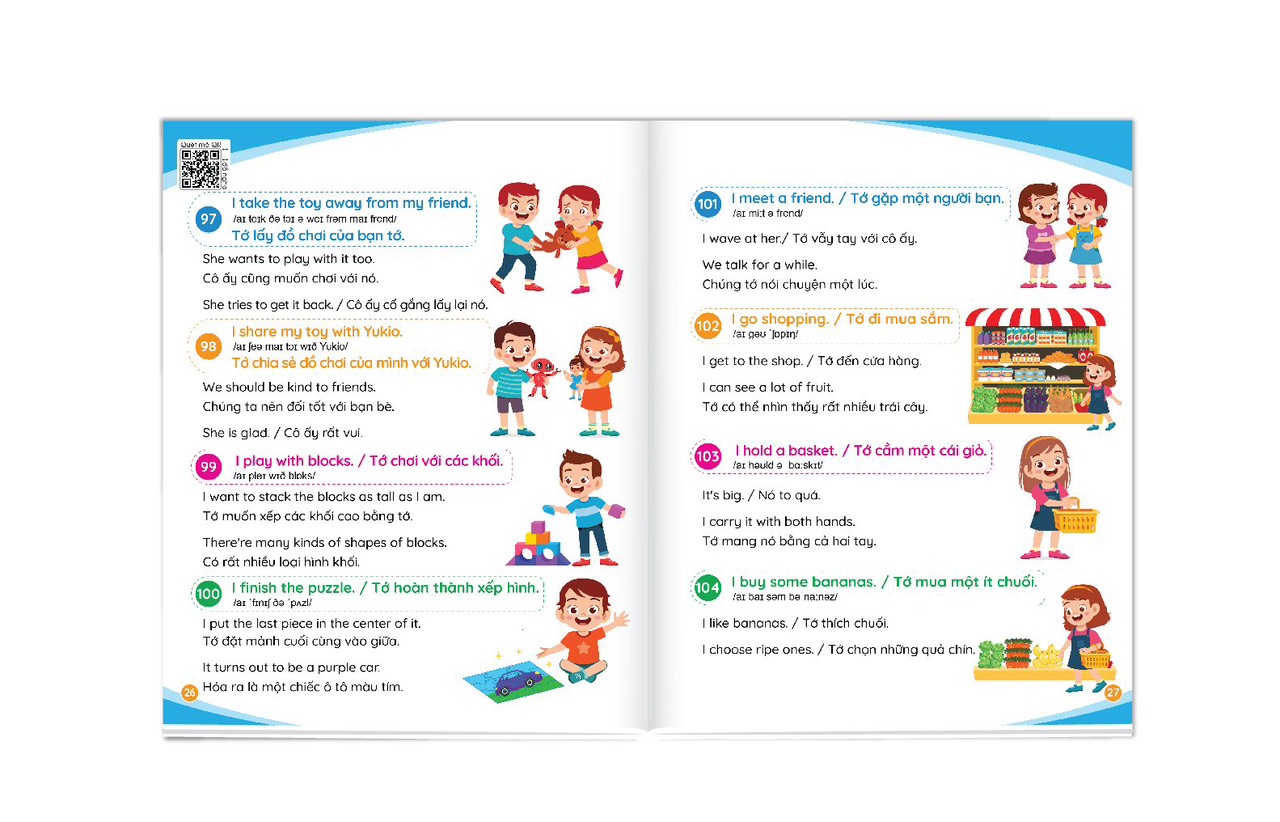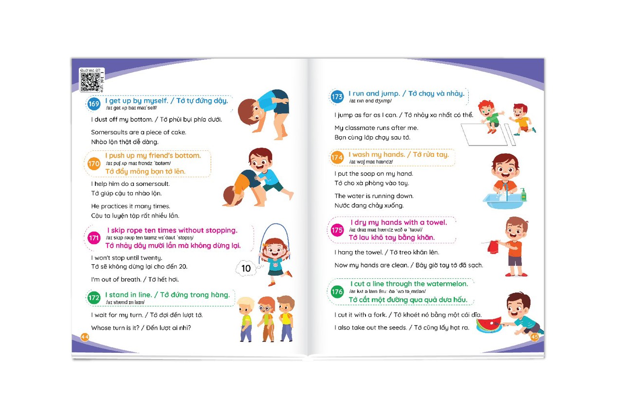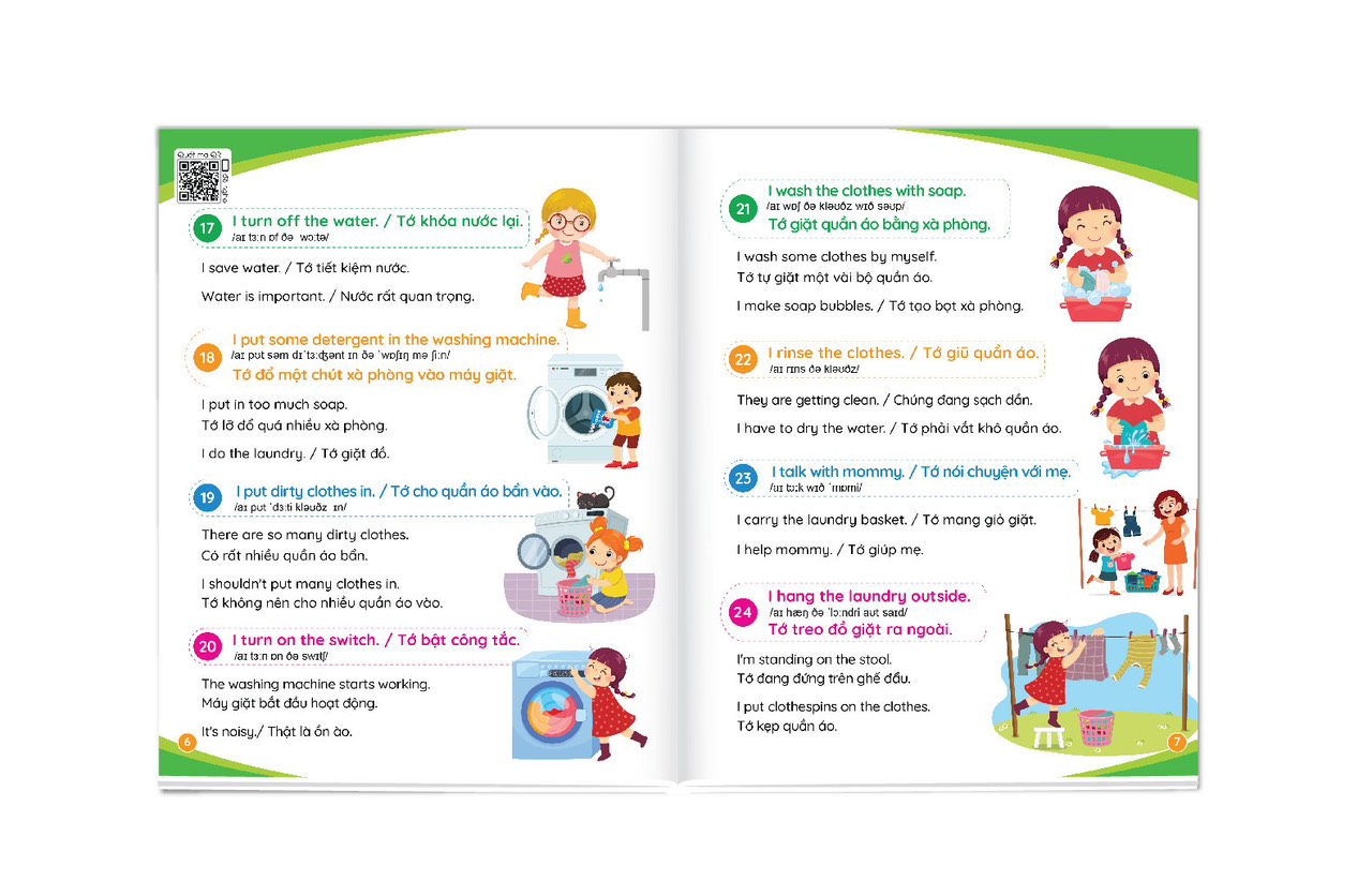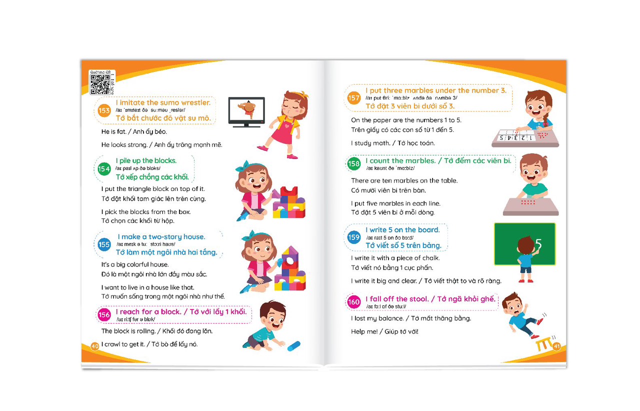 Sách có kèm file nghe quét mã QR với giọng đọc tiếng Anh chuẩn để cha mẹ và con cùng nghe và tắm ngôn ngữ mỗi ngày.