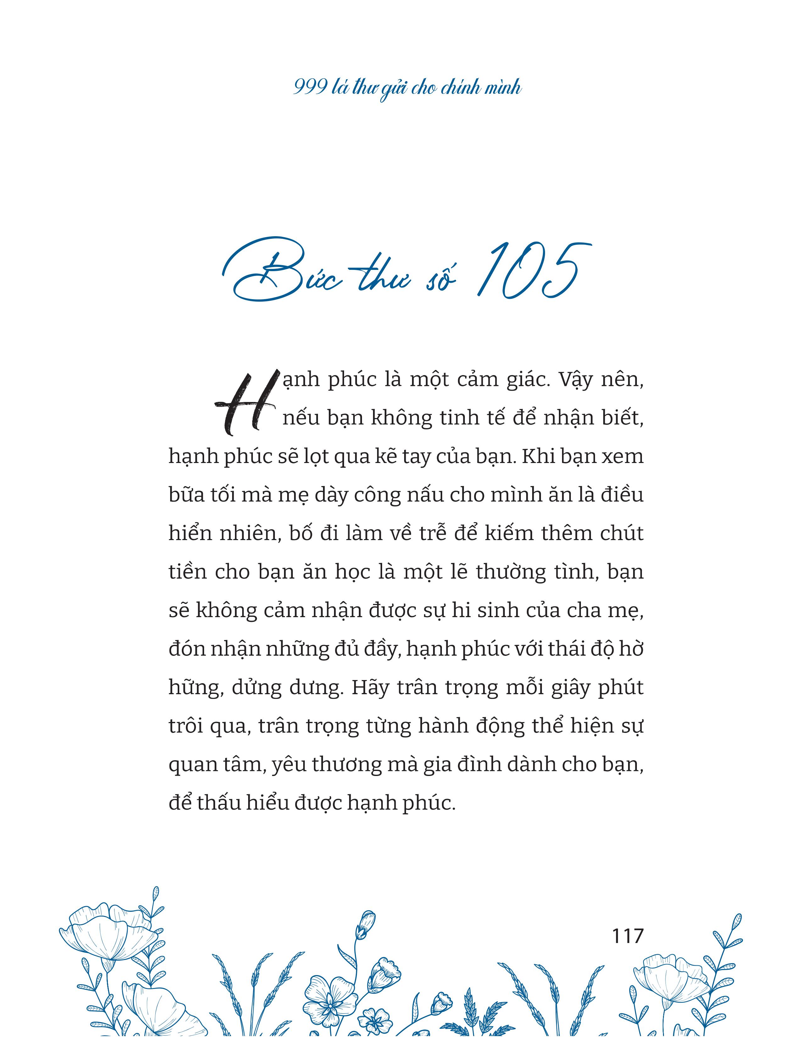 Trong dòng chảy vội vã của thời hiện đại, tuổi trẻ nào ắt cũng đôi lần tường trải sự chênh vênh trong sự nghiệp, tình yêu và cuộc sống. Đó là lần bạn mất điểm tựa trong tâm hồn, hoài nghi chính mình, loay hoay với những điều mới mẻ, lạ lẫm cùng những khó khăn bủa vây. Càng trưởng thành, bạn sẽ phải học được bài học rằng dựa vào núi, núi sẽ đổ, dựa vào người, người rồi cũng bỏ mà đi, chỉ có thể tự lực cánh sinh mới là chỗ dựa vững chãi nhất. Hiểu được điều đó, cuốn sách 999 lá thư gửi cho chính mình ra đời để giúp bạn củng cố một nội lực bên trong vững chãi, vượt lên tất cả những khó khăn bủa vây lấy bạn, kiên cường để bước về phía trước, chạm tay đến thành công.