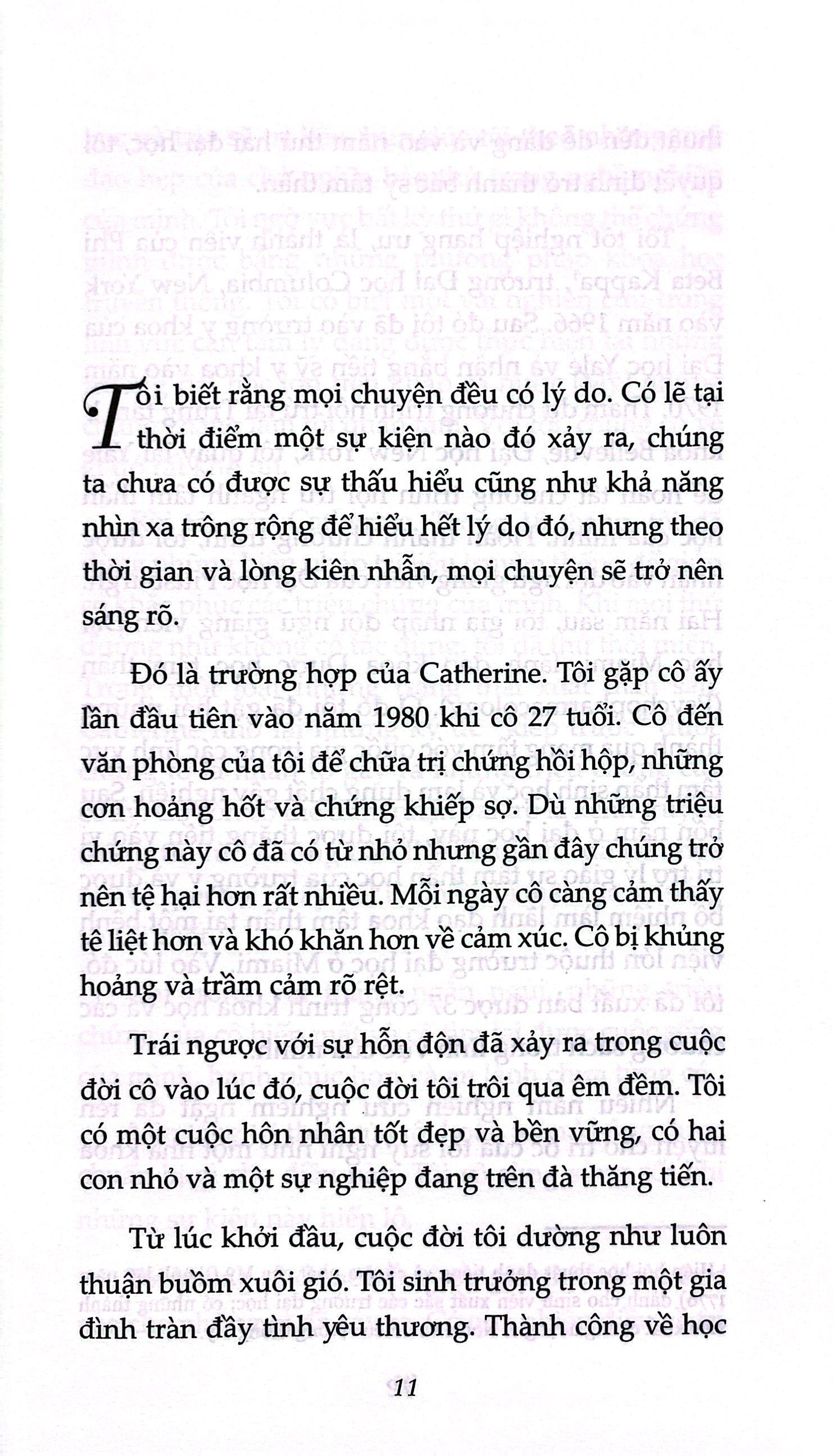 Vốn là nhà tâm lý trị liệu truyền thống, TS. Brian Weiss đã kinh ngạc và bi quan khi một trong những bệnh nhân của m.ình bắt đầu nhớ lại những chấn thương trong kiếp trước mà chúng dường như là chìa khóa để giải quyết những cơn ác mộng và lo lắng lặp đi lặp lại. Tuy nhiên, chủ nghĩa bi quan của ông bị xói mòn khi cô ấy bắt đầu phát những thông điệp từ “những sinh thể ở giữa không gian,” chứa đựng những tiết lộ quan trọng về gia đình của TS. Weiss và cái chết của con trai ông. Bằng biện pháp kiếp trước, ông có khả năng chữa lành cho bệnh nhân và mở ra một giai đoạn mới đầy ý nghĩa trong nghề nghiệp của chính m.ình.