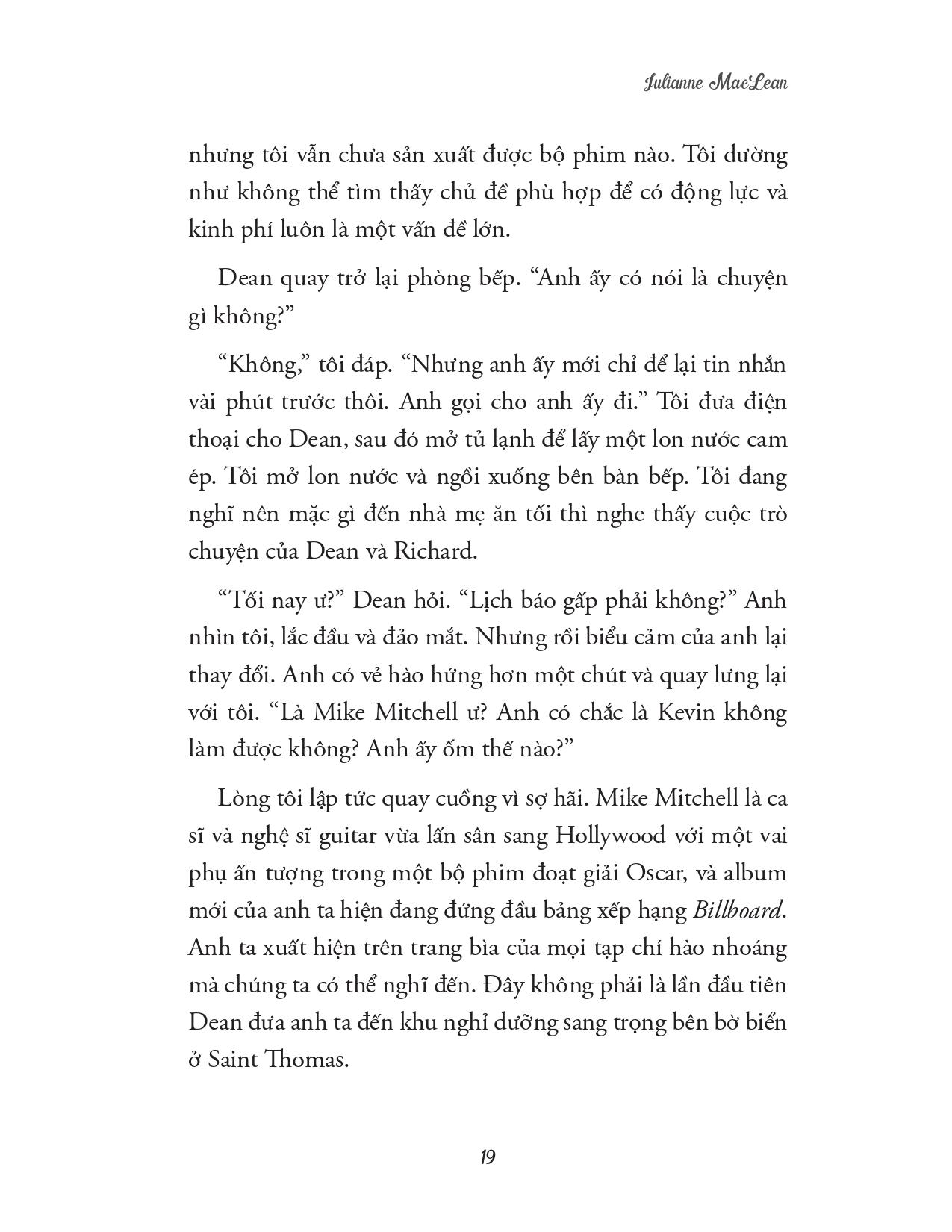 Bên Kia Vùng Biển Sáng Trăng Nội dung chính Olivia Hamilton, một cô gái trong sáng và thuần khiết, như ý nguyện được kết hôn với tình yêu của đời m.ình, Dean, chàng phi công quyến rũ chuyên lái máy bay riêng cho những người giàu có và nổi tiếng. Cuộc sống của họ trôi qua bình dị cho đến một ngày nọ, Dean đột ngột biến mất khi bay ngang qua Tam giác Quỷ Bermuda. Thế giới của Olivia đã hoàn toàn bị đảo lộn. Sau nhiều năm chờ đợi, cuối cùng Olivia cũng phải buông bỏ niềm hy vọng mong manh rằng người chồng yêu dấu của m.ình có thể vẫn còn sống. Melanie Brown là một nhà vật lý học ngày đêm nghiên cứu về bí ẩn của Tam giác Quỷ Bermuda. Nhưng hứng thú nghiên cứu của cô dần mất khi mẹ của cô qua đời trong một tai nạn thương tâm. Để làm lại cuộc đời và cứu vãn sự nghiệp của m.ình, cô quyết định tìm đến một phòng khám tâm lý, và bất ngờ bước vào cuộc tình ngang trái với chính bác sĩ trị liệu của m.ình. Tưởng chừng như cuộc đời của hai người phụ nữ này chẳng liên quan, nhưng họ lại bất ngờ giao nhau ở một điểm. Mối liên hệ kỳ lạ của hai người đã mở ra những bí mật có khả năng thay đổi mọi thứ mà Olivia nghĩ rằng cô ấy biết về cuộc hôn nhân, chồng cô ấy và quan trọng nhất là bản thân cô ấy. Với những khúc ngoặt đầy mê hoặc, Bên kia vùng biển sáng trăng là một cuốn tiểu thuyết sống động, giàu cảm xúc về sức mạnh lay động của tình yêu đánh mất rồi lại tìm thấy - và sức mạnh phi thường của một người phụ nữ đấu tranh cho hạnh phúc sau bi kịch. Tác giả Julianne MacLean là tác giả có sách bán chạy nhất của USA Today với hơn 30 tiểu thuyết, trong đó có bộ sách nổi tiếng Color of Heaven. Độc giả mô tả những cuốn sách của cô ấy là “ngoạn mục”, “có hồn” và “nâng đỡ tinh thần”. MacLean đã bốn lần lọt vào vòng chung kết của giải thưởng RITA dành cho Nhà văn Lãng mạn Hoa Kỳ và đã giành được nhiều giải thưởng, bao gồm Booksellers’ Best Award và Reviewers’ Choice Award của Romantic Times. Tiểu thuyết của cô đã bán được hàng triệu bản trên toàn thế giới và đã được dịch ra hơn 10 loại ngôn ngữ khác nhau. MacLean có bằng Văn học Anh tại King’'s College ở Halifax, Nova Scotia và bằng kinh doanh của Đại học Acadia ở Wolfville, Nova Scotia. Cô ấy thích đi du lịch và đã sống ở New Zealand, Canada và Anh. Cô hiện đang sống ở bờ biển phía đông Canada trong một ngôi nhà ven hồ cùng chồng và con gái.