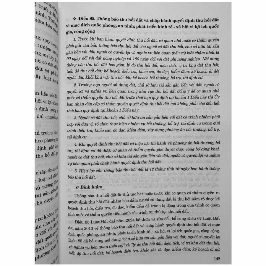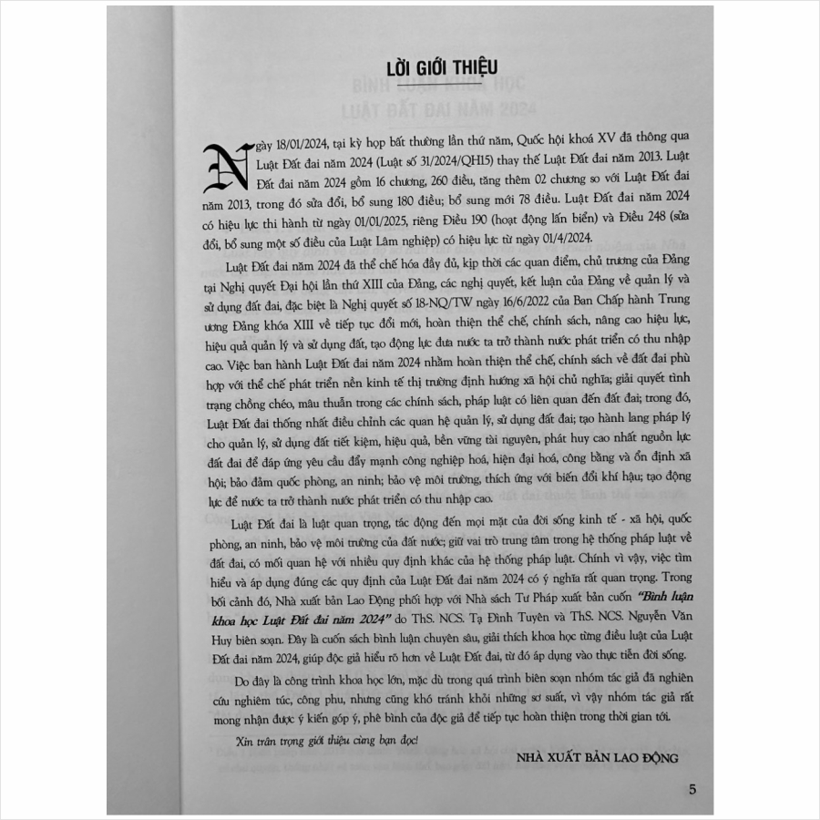 Nhằm phổ biến đến Quý Cơ quan, Đơn vị và Quý khách hàng thân thiết nắm bắt kịp thời những quy định mới nêu trên. Nhà sách Nam Việt xin trân trọng giới thiệu cuốn sách: Bình Luận Khoa Học Luật Đất Đai năm 2024 do ThS. NCS. Tạ Đình Tuyên và ThS. NCS. Nguyễn Văn Huy biên soạn. Đây là cuốn sách bình luận chuyên sâu, giải thích khoa học từng điều luật của Luật Đất đai, giúp độc giả hiểu rõ hơn về Luật Đất đai, từ đó áp dụng vào thực tiễn đời sống.